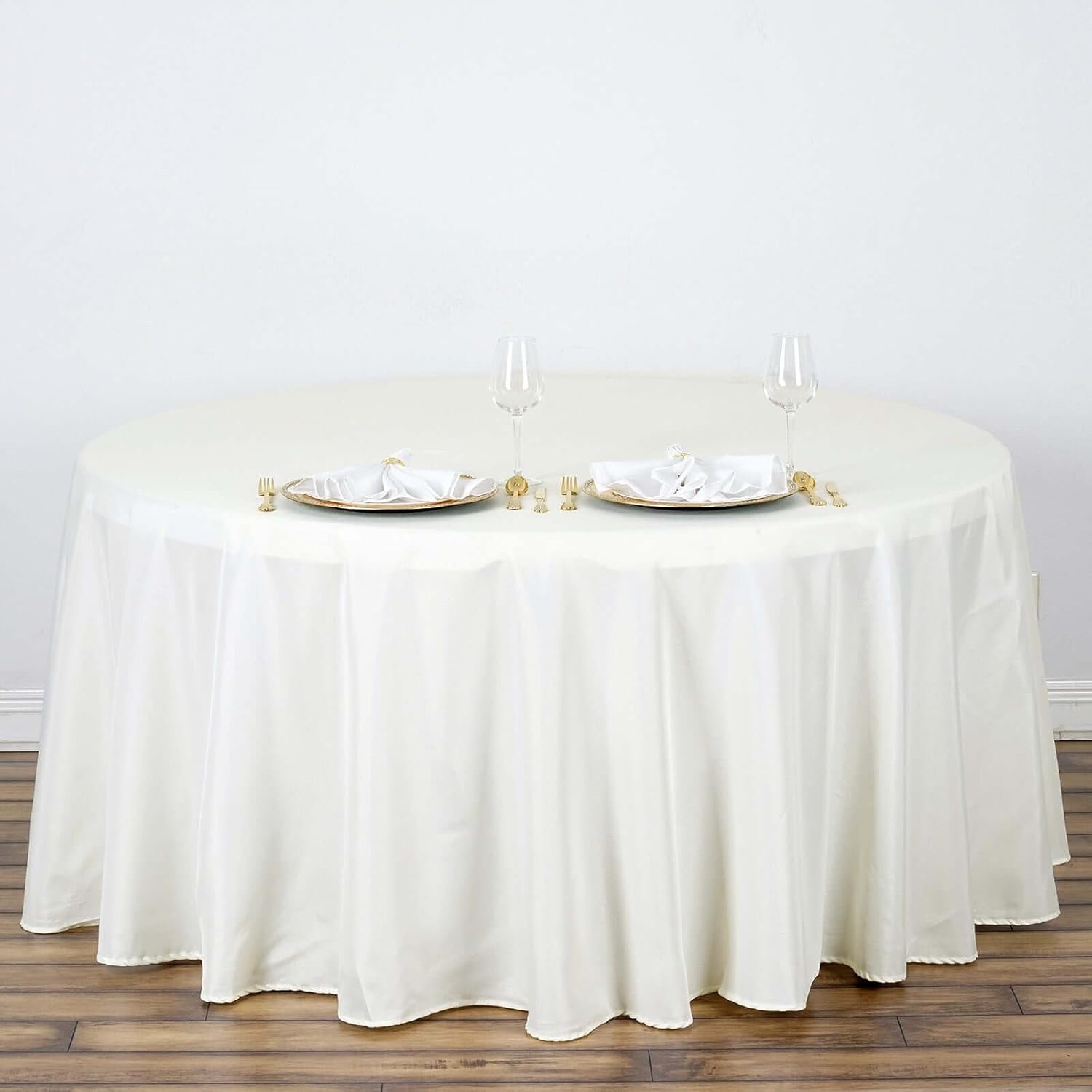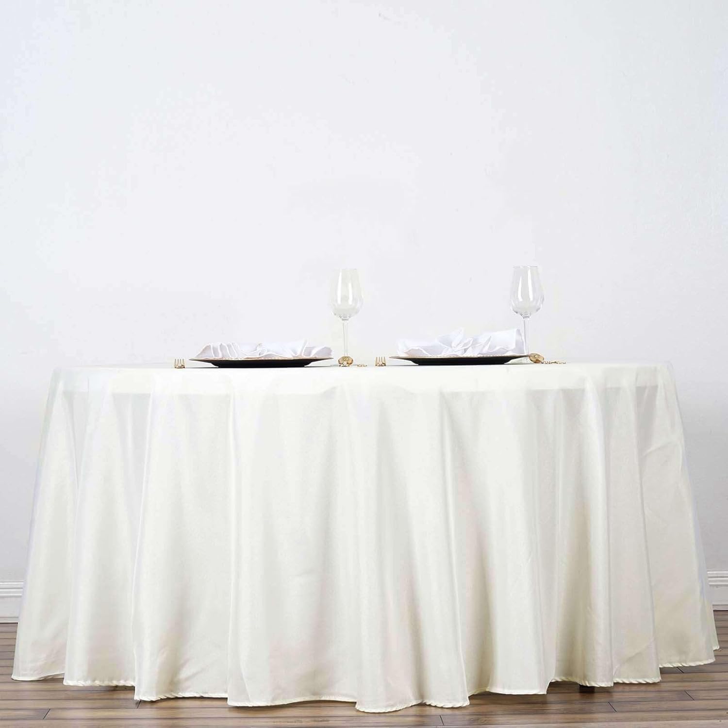 - Quantity: 1 Round Tablecloth Material: 100% Polyester Color: Ivory Size: 120" Round Thickness: 200 GSM Stain & Wrinkle Resistant, Machine Washable 1 piece, seamless design Hemmed edges for an exquisite look. Gives floor length hang on standard 5FT (60") tables All sizes are approximate measurements