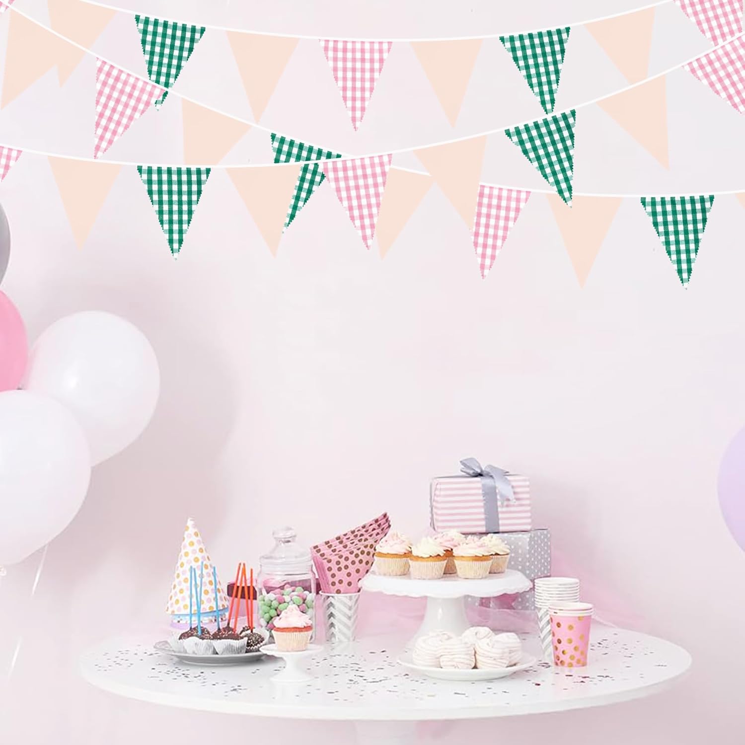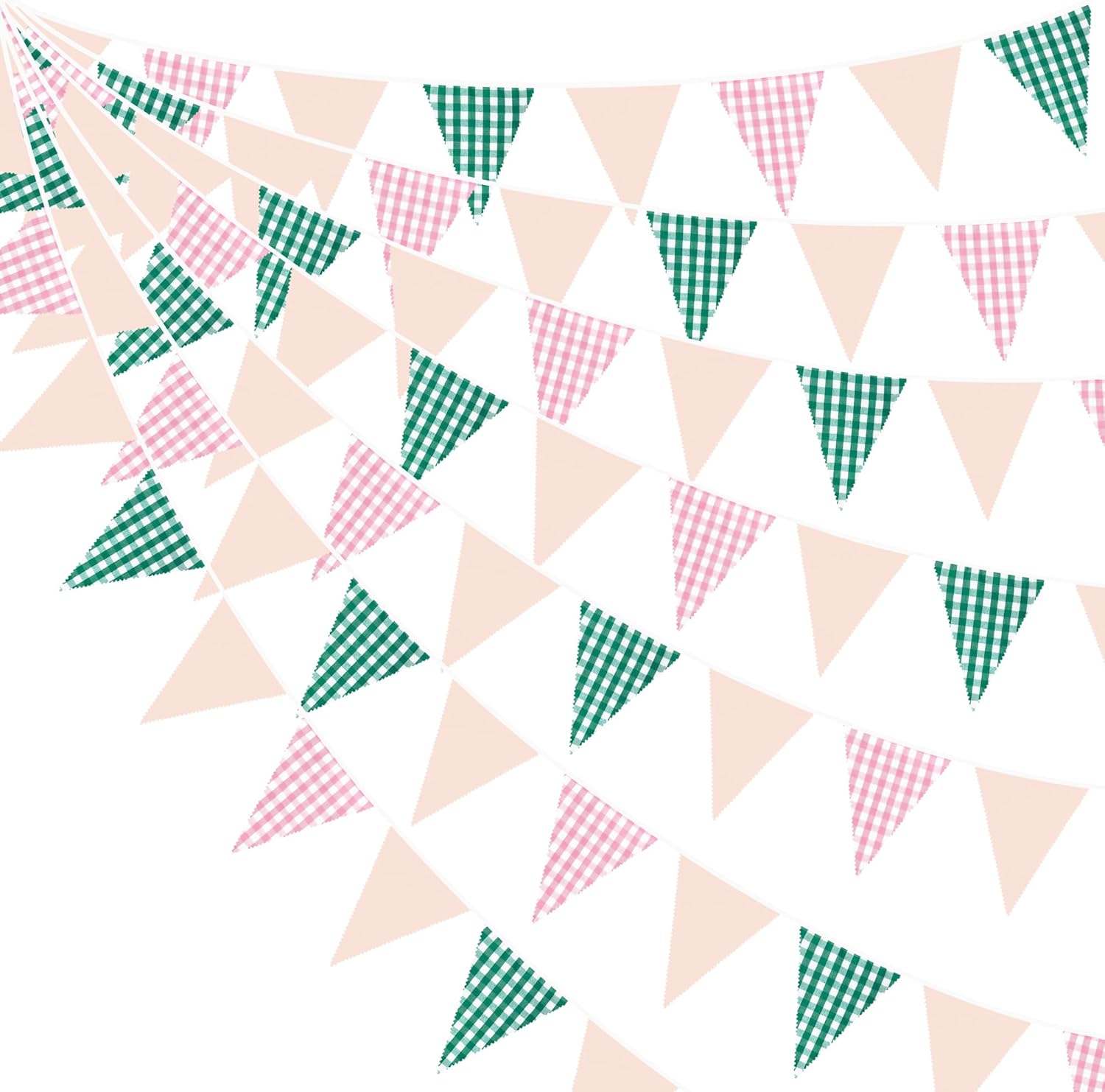 - Package Including:1 pack pink and green buffalo plaid checkered fabric bunting banner garland in pink gingham, green gingham and pink colors, with 36pcs flags in 10M/32.8Feet. Flag Size: 5.5in width x 7in height.