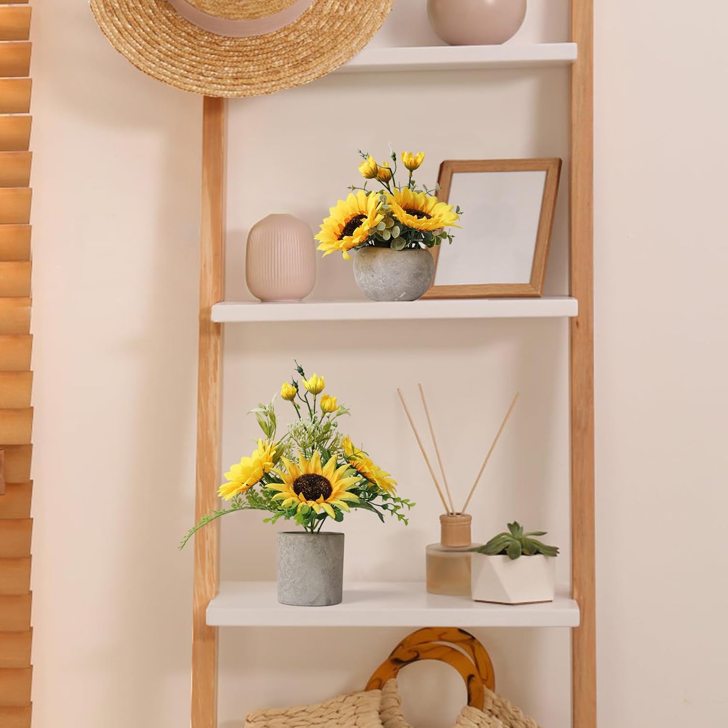 - Package:2 Pcs Sunflowers artificial flowers pot set includes 5 pcs fake flowers,Some small flowers,Plants and eucalyptus for sunflower kitchen decor;sunflower bathroom decor;summer decorations for home;yellow decor