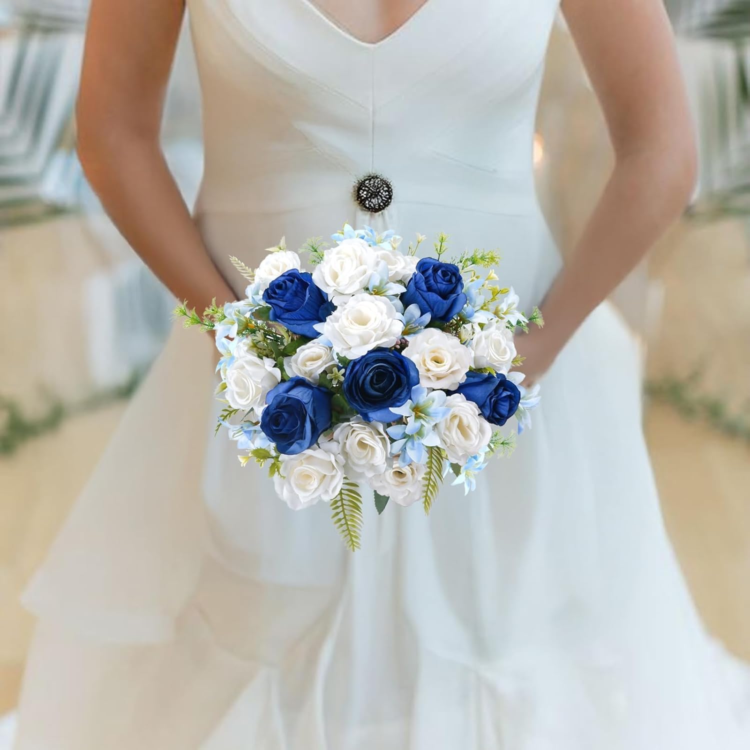 - [Multiple collocation]:Faux flower bouquet showcases a harmonious blend of delicate white roses and elegant blue roses. You can use these artificial flowers to make bridal bouquets,boutonnieres,wedding centerpieces and more.