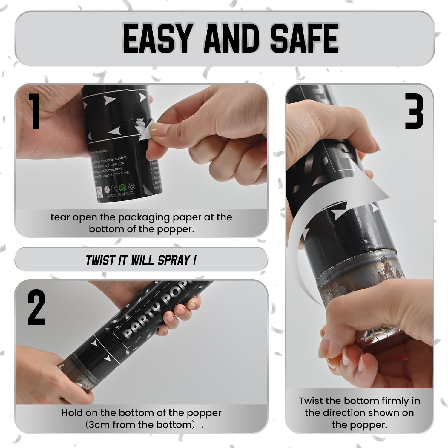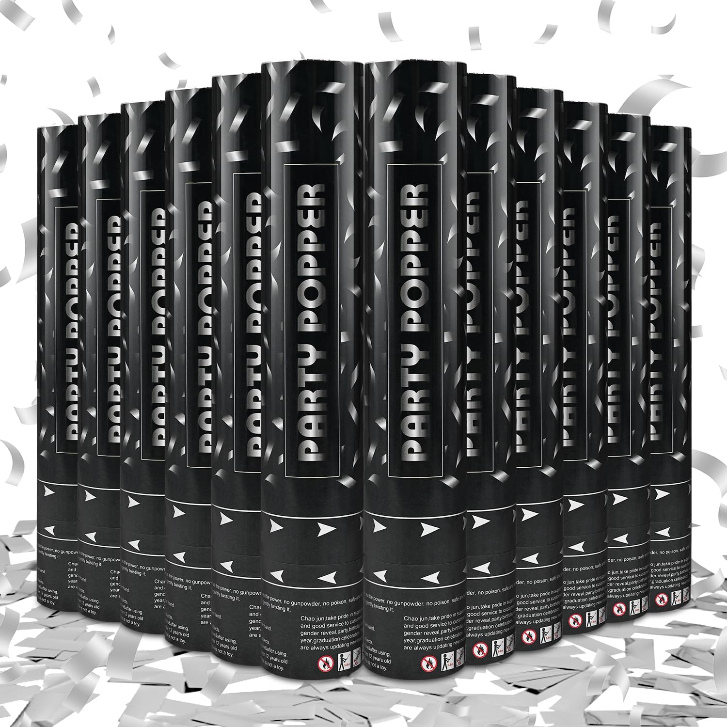 - Confetti Cannon 12 Pack - Don't worry about struggling to pop the confetti cannon, simply tear open the packaging paper at the bottom of the party popper and twist to release a burst of silver confetti flying up to 10-15 feet in the air. It's that simple, and party cannon will add an extra touch of magic to your celebration!