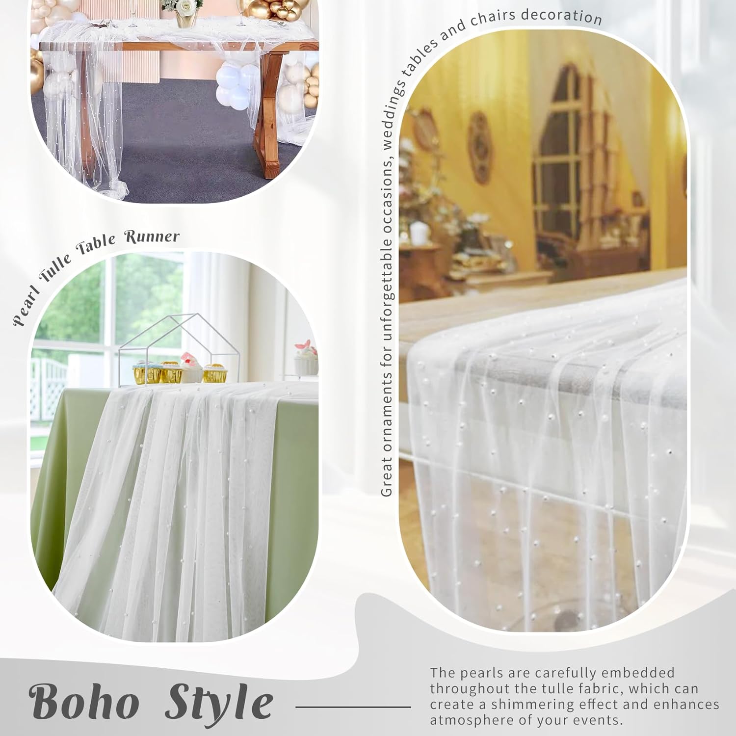 - 【Exquisite Workmanship】 These romantic table runners are made of premium tulle. Soft feeling, sheer, reusable, easy to clean and fade resistant. Delicate pearls embellished table runner works perfectly for many types of event decor, which will add a ton of elegance to any space.