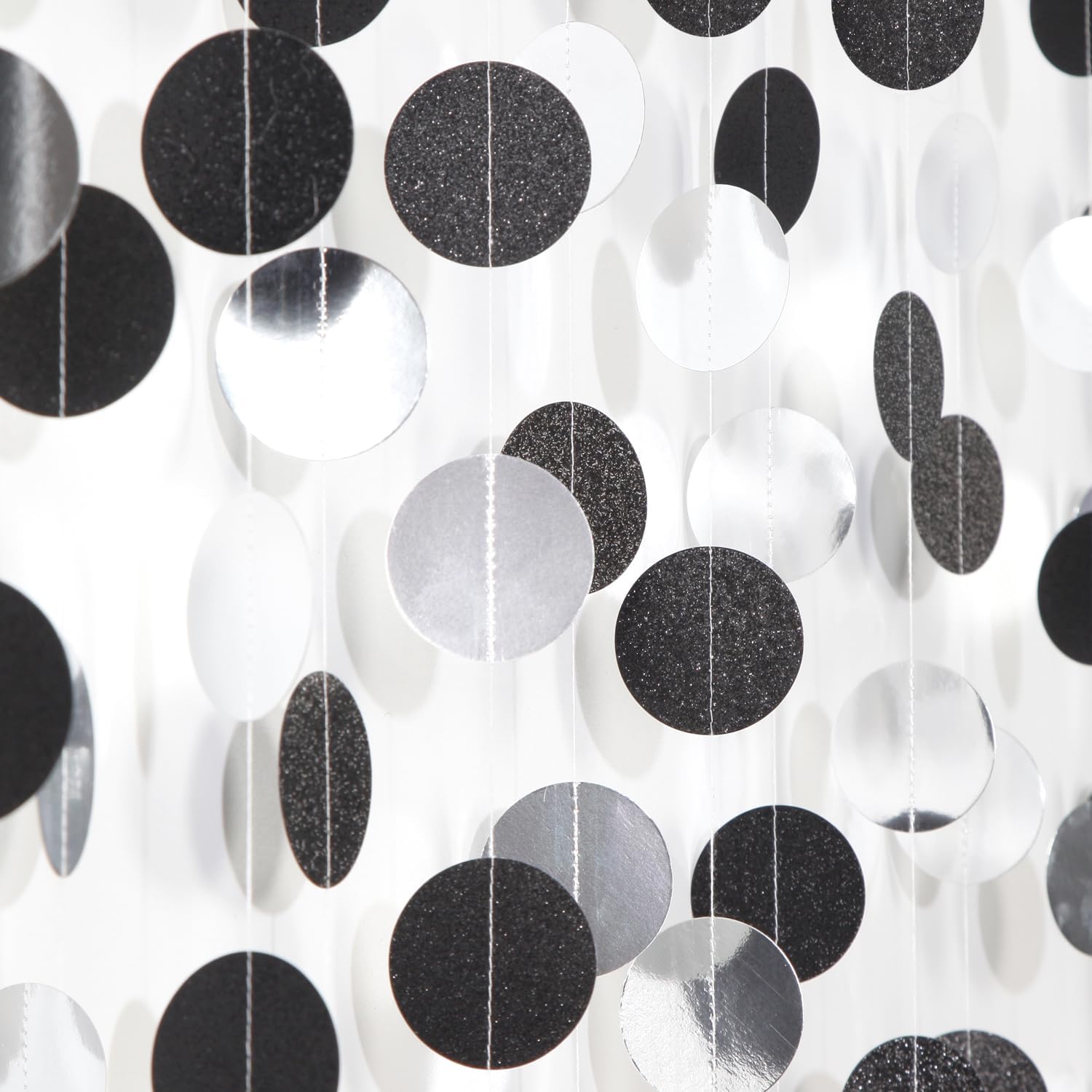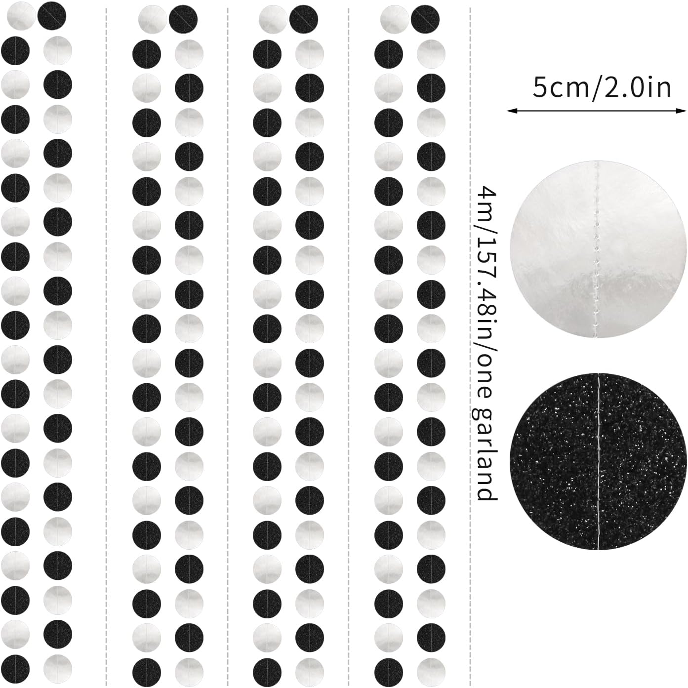 - PACKAGE CONTAINS: This set has four glitter black silver circle paper garland,the length of each strand is 4 meters/13 feet, the total length is 16 meters/52 feet.The size is 2IN.