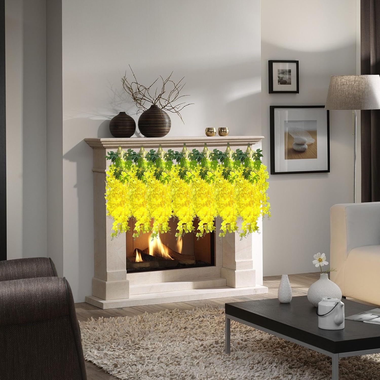 - 【Package Included】12 pieces of silk yellow wisteria hanging flowers, each length 41.27 inches. Every artificial wisteria garland has 3 branches and 6 leaves, the wisteria flower petal length is 21.62 inches. It also comes with a warm light string that requires 2 AA batteries (Note: There may be some color differences in different lights, product not include batteries)