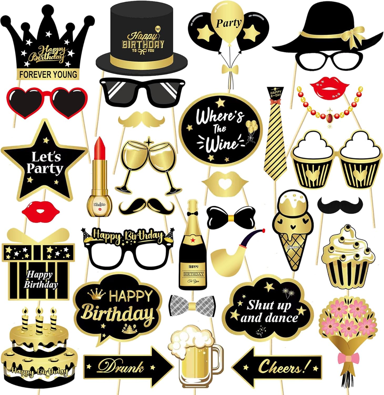 34pcs Birthday Party Photo Booth Props Kit, Favors Supplies for Men Women Party Decor Photobooth,Funny Birthday Party Supplies(Gold and Black)