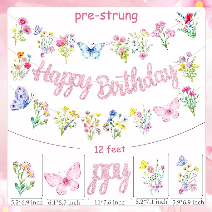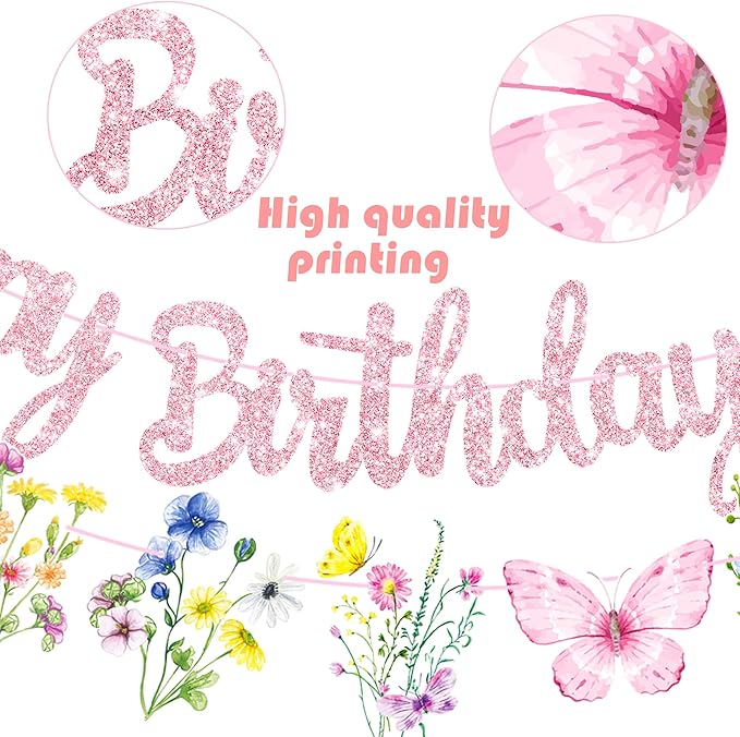 - 3Pcs wildflower birthday banners:The package contains 2pcs colorful wildflower theme banners and 1pcs pink glitter happy birthday sign banner, a total of 3 banners. With 18 different wildflower and butterfly patterns, feel the relaxing and cheerful atmosphere of nature