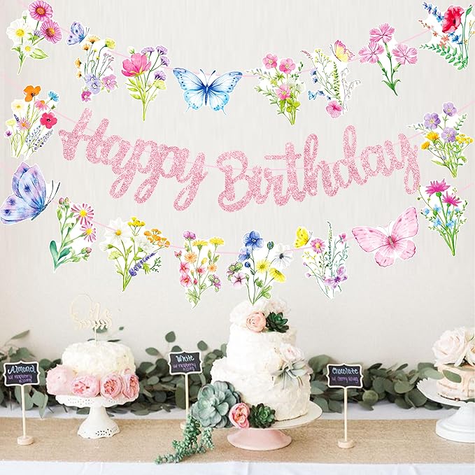 Wildflowers Happy Birthday Banners 3Pcs Pink Butterfly Theme Party Decorations for Women Girl Spring Birthday Baby Shower Supplies