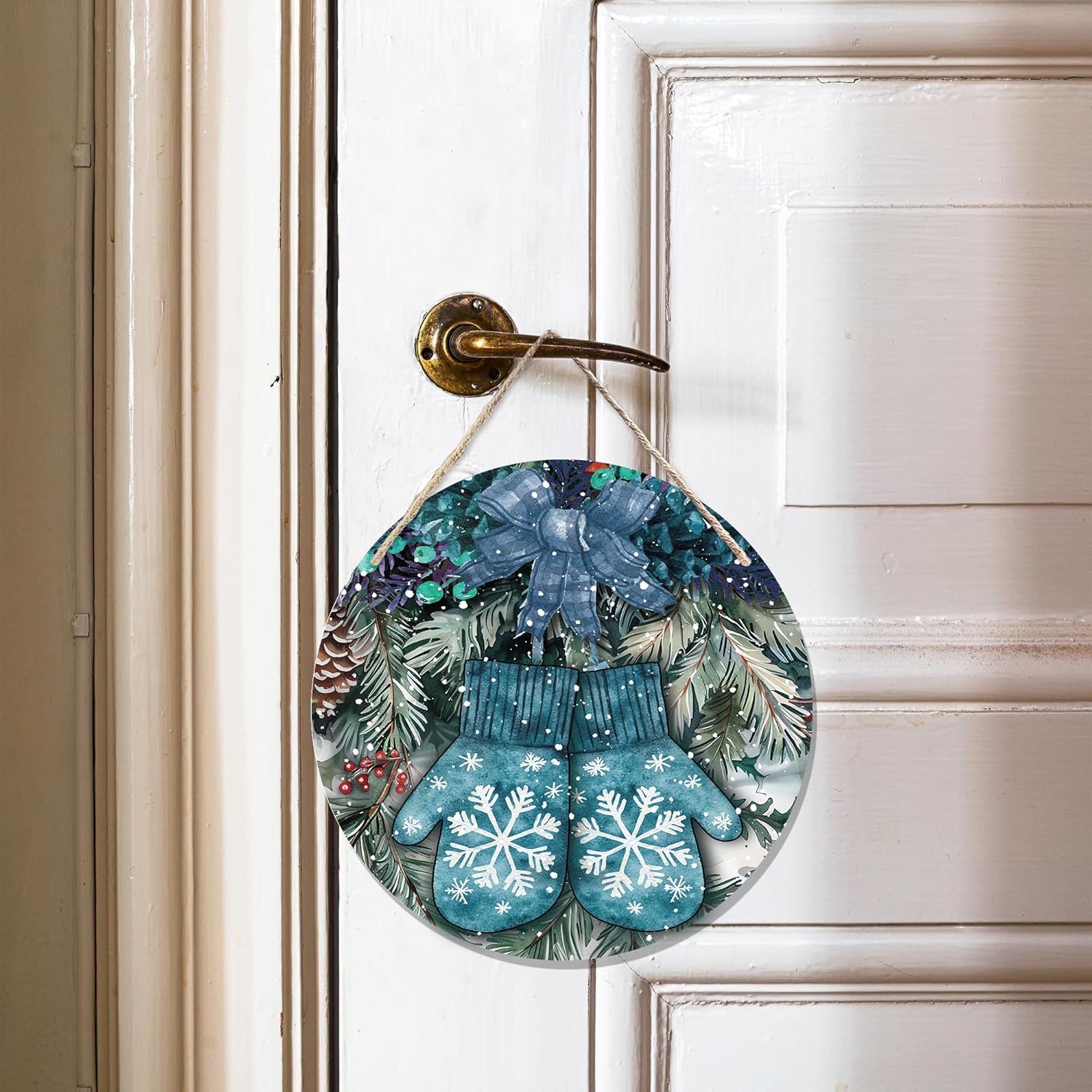 Navy Blue Winter Christmas Wooden Sign, Winter Snowflake Gloves Blue Plaid Bow Decoration Hanging Sign Wall Decor, Farmhouse Seasonal Holidays Wooden Signs for Home Door Decor 12 x 12 Inch