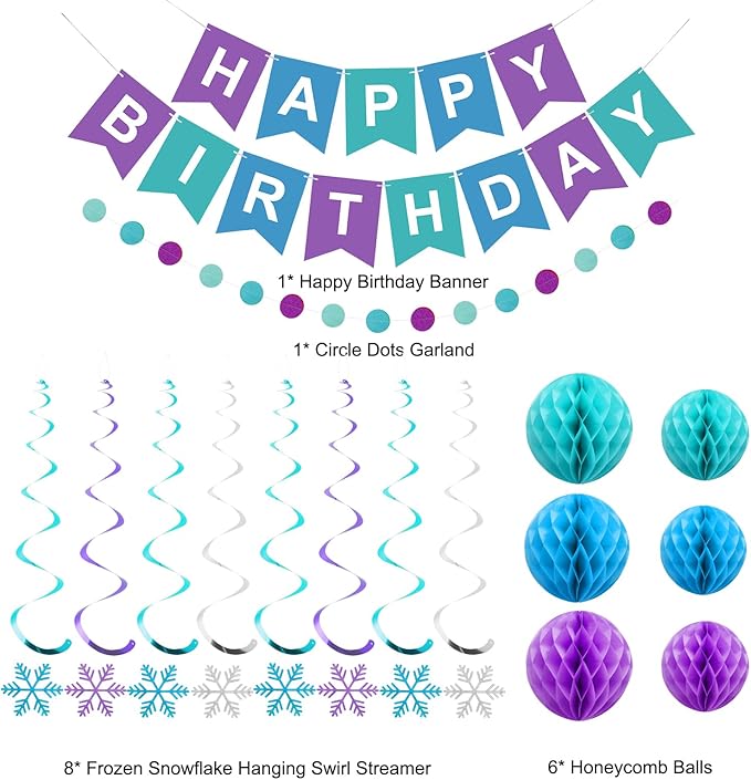 - Package Including: With our Birthday Party Decorations package, you'll have everything you need to create the perfect party atmosphere. You can get 1pcs Happy Birthday Banner, 6pcs Honeycomb Balls, 8pcs Frozen Snowflake Swirls Streamers, and 1pcs Circle Dots Decorations. No need to worry about running around and finding individual items. It's convenient package.