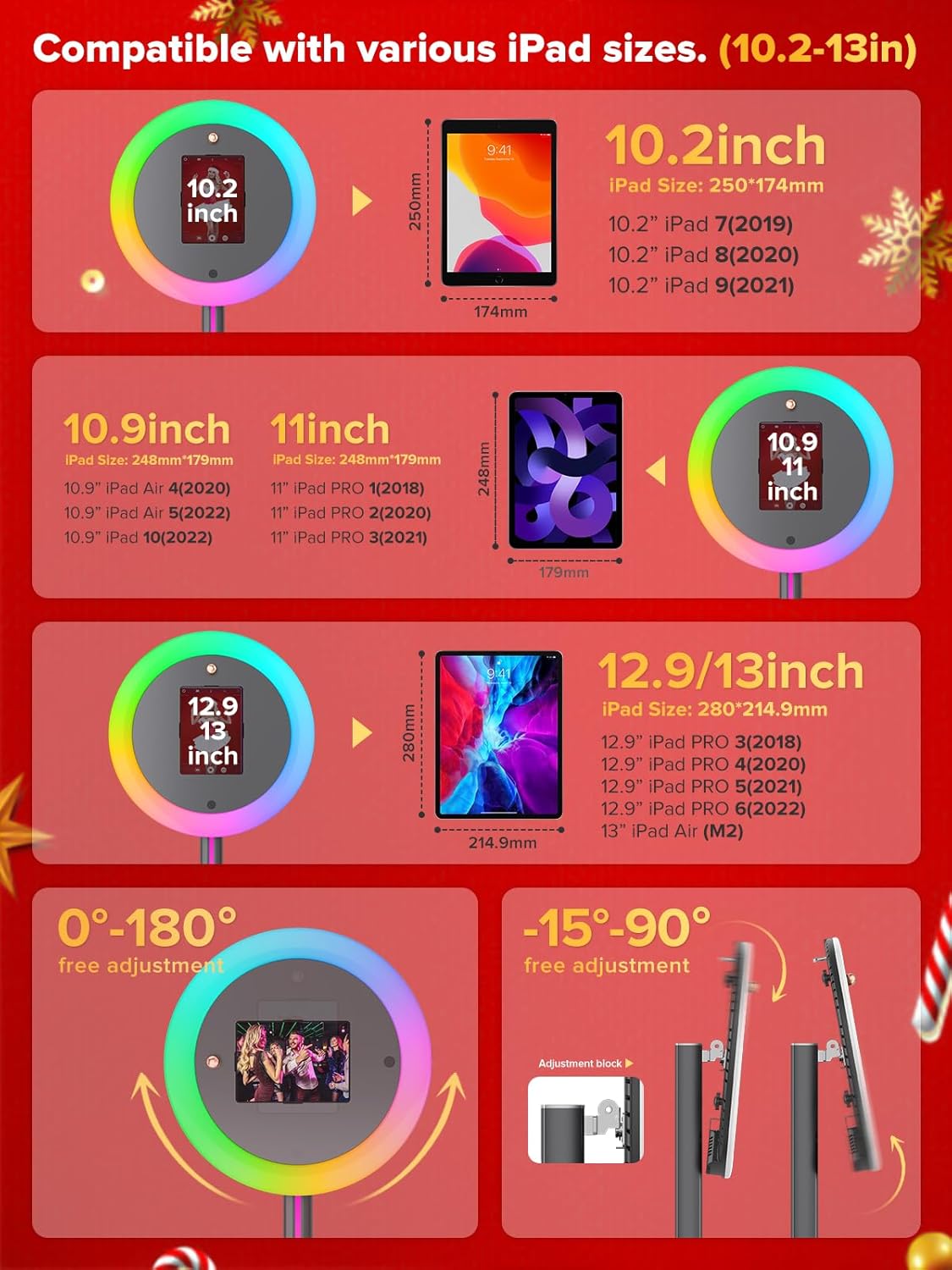 - Compatible with All Size i-Pads: This i Pad photo booth is made to be as adaptable as possible, and it can fit a variety of tablet models (10.2in/10.9in/11in/12.9in). It guarantees a smooth connection and optimal performance for various tablet sizes.A secure fit is provided by the stable installation, guaranteeing seamless functioning. You can quickly take, share, and post pictures to social media sites like Facebook, YouTube, Twitter, and TikTok.