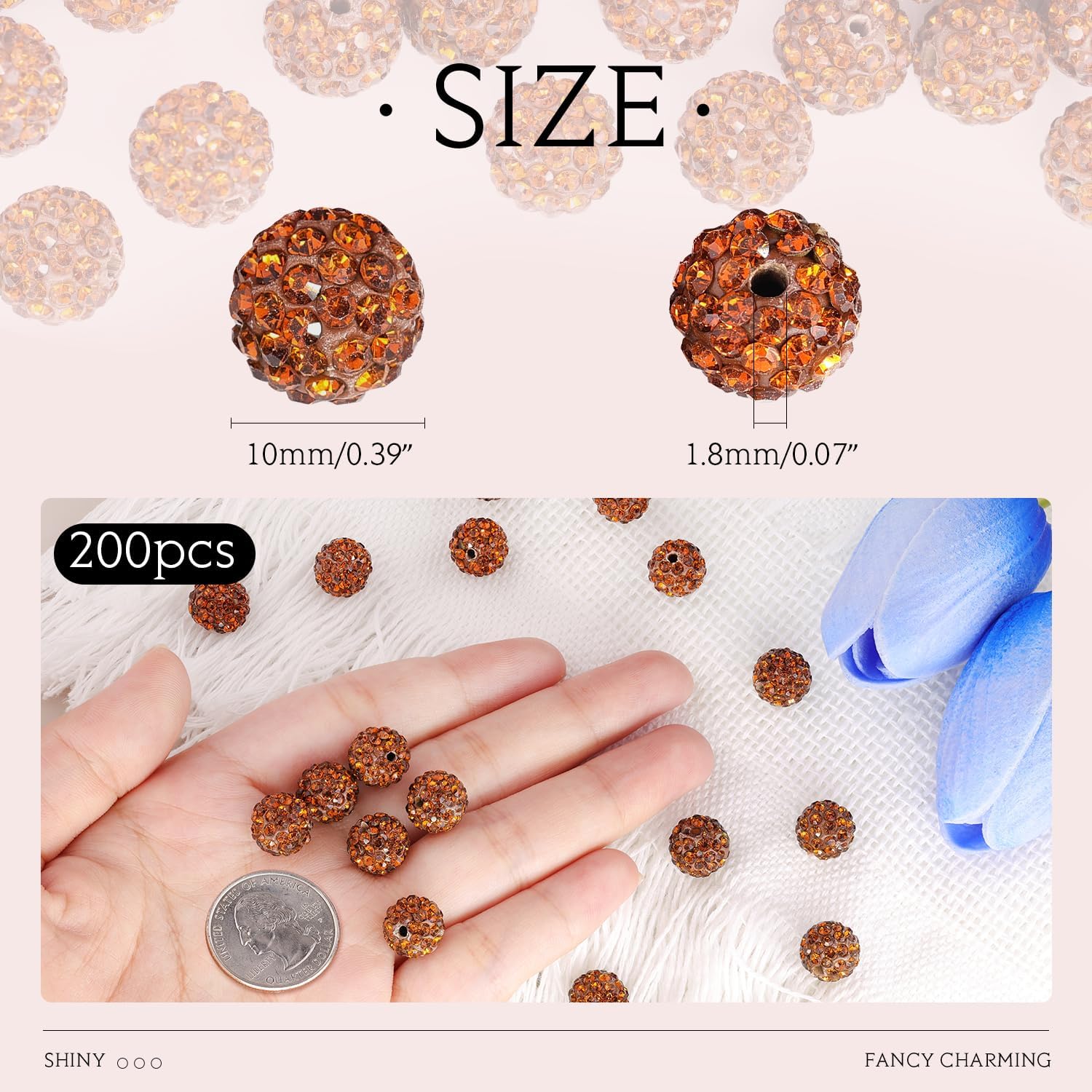 200pcs 10mm Brown Rhinestone Beads for Jewelry Making, Shiny Round Shamballa Disco Ball Beads Bulk, Sparkle Crystal Clay Christmas for Bracelet Baseball Necklace Earring Crafting and DIY