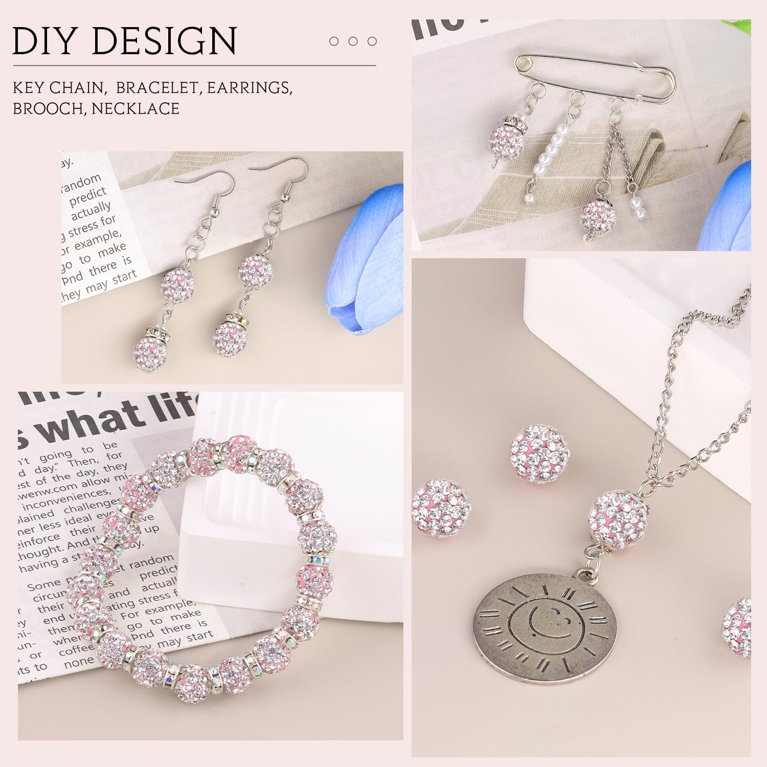 200pcs 10mm Pink White Rhinestone Beads for Jewelry Making, Shiny Round Shamballa Disco Ball Beads Bulk, Sparkle Crystal Clay Christmas for Bracelet Baseball Necklace Earring Crafting and DIY