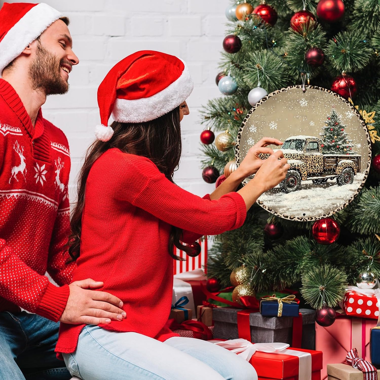 Round Leopard Truck Metal Tin Sign Rustic Wall Decor Christmas Wreath Sign Christmas Wreath Door Hanging Wall Decoration Bar Home Round 12 * 12 in