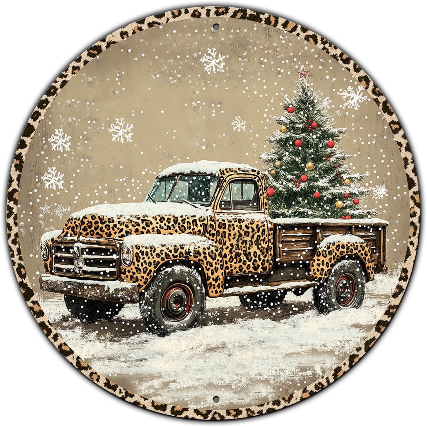 Round Leopard Truck Metal Tin Sign Rustic Wall Decor Christmas Wreath Sign Christmas Wreath Door Hanging Wall Decoration Bar Home Round 8 * 8 in