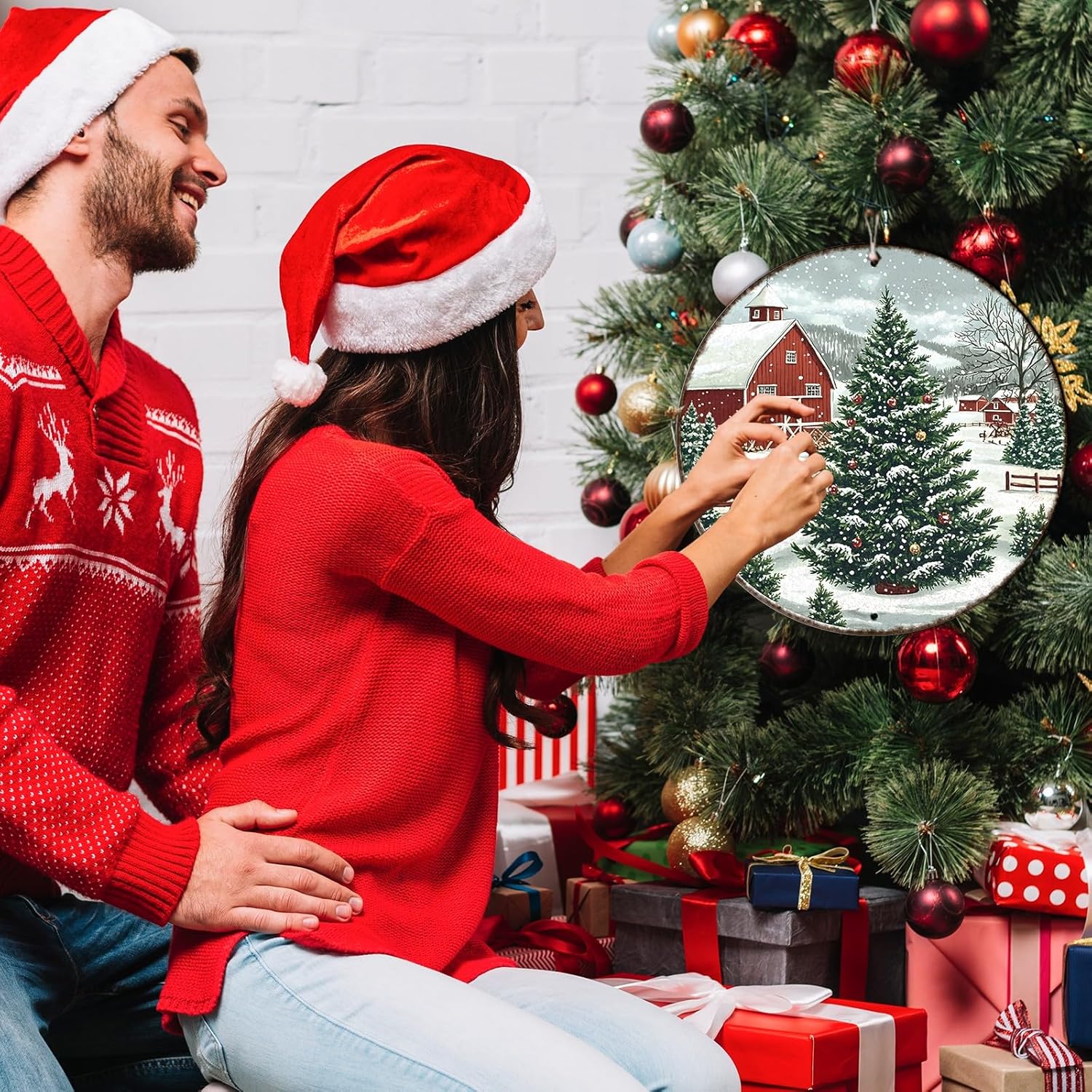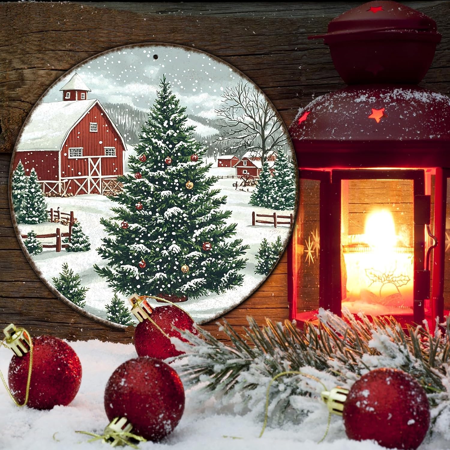 Round Christmas Trees Barn Metal Tin Sign Christmas Vintage Tin Sign for Kitchen Cafe Bar Farmhouse Home Wall Decor Art Winter Decoration 12 * 12 in
