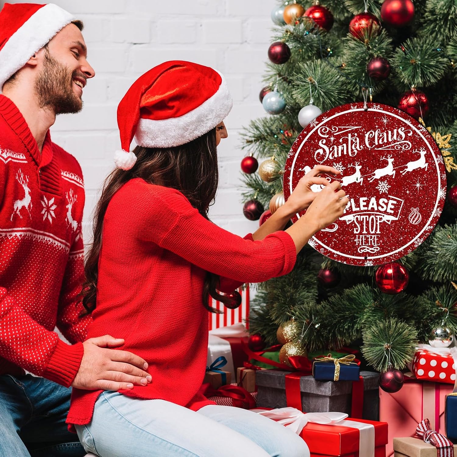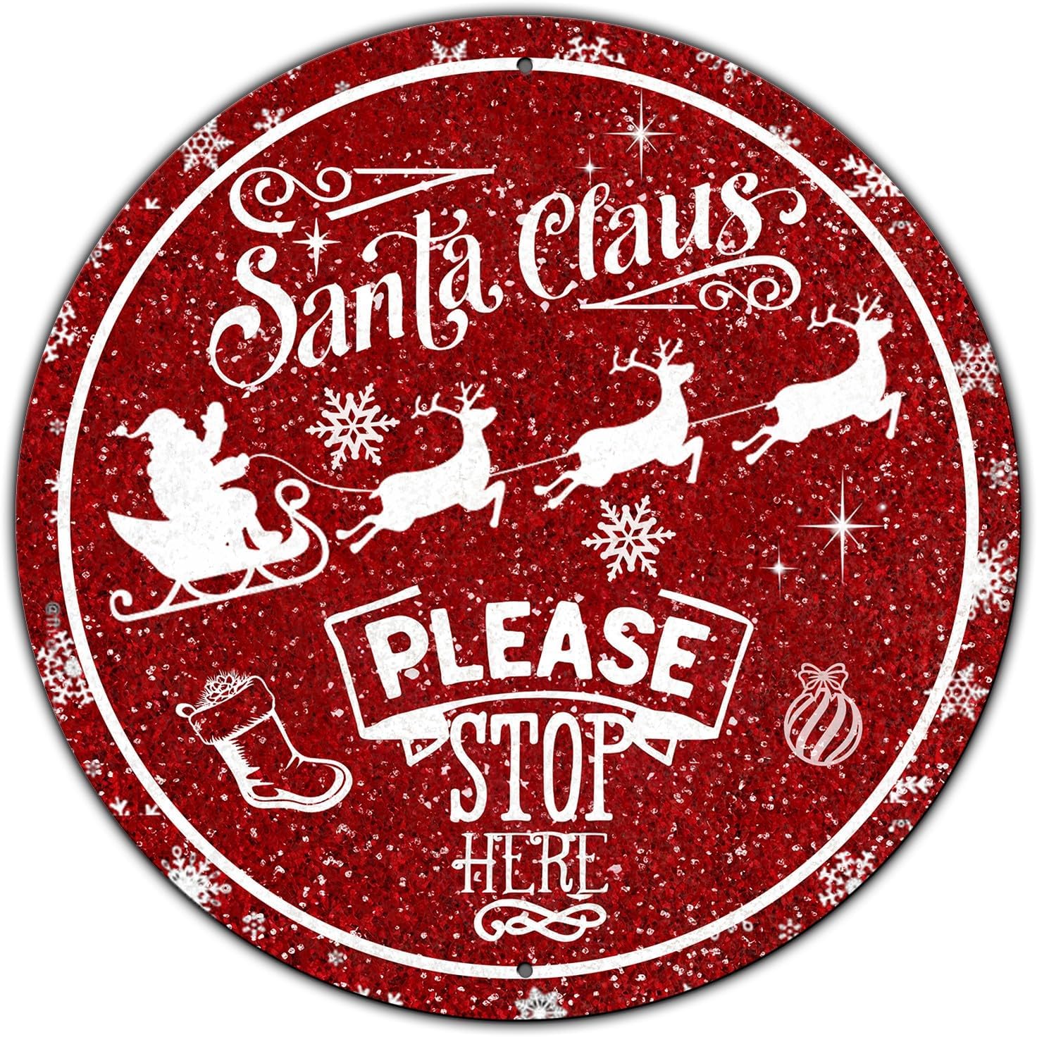 Round Metal Tin Sign - Santa Sleigh Reindeer Vintage Sign - Santa Claus Please Stop Here Sign for Christmas Living Room Bedroom Coffee Bar - 12 * 12 in
