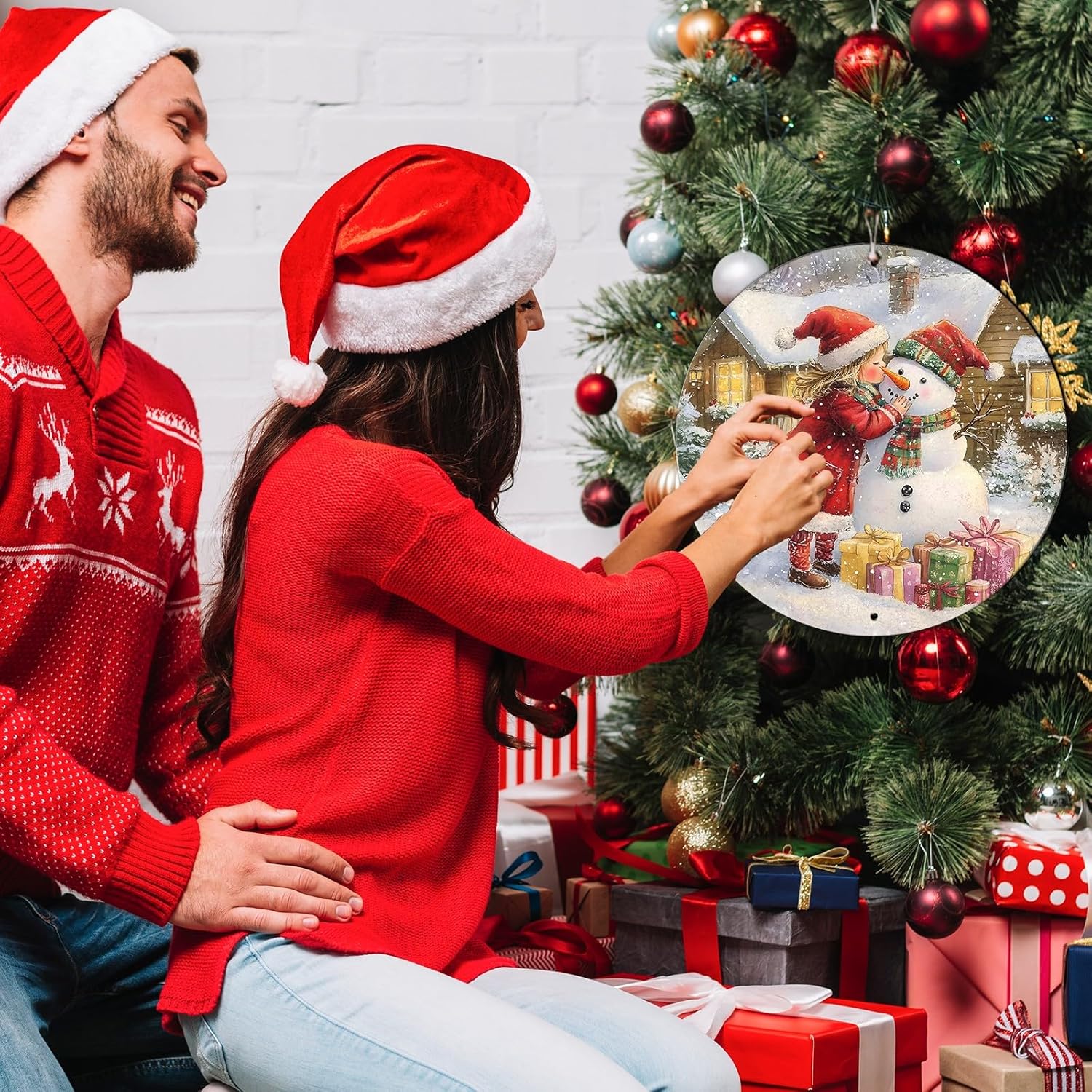 Round Wall Decor Christmas Metal Tin Sign Girl and Snowman Sign Rustic Wall Decor Wall Plaque Snowman Wreath Sign for Christmas Round Wreath Wall Decor Vintage Garage Yard Home 12 * 12 in