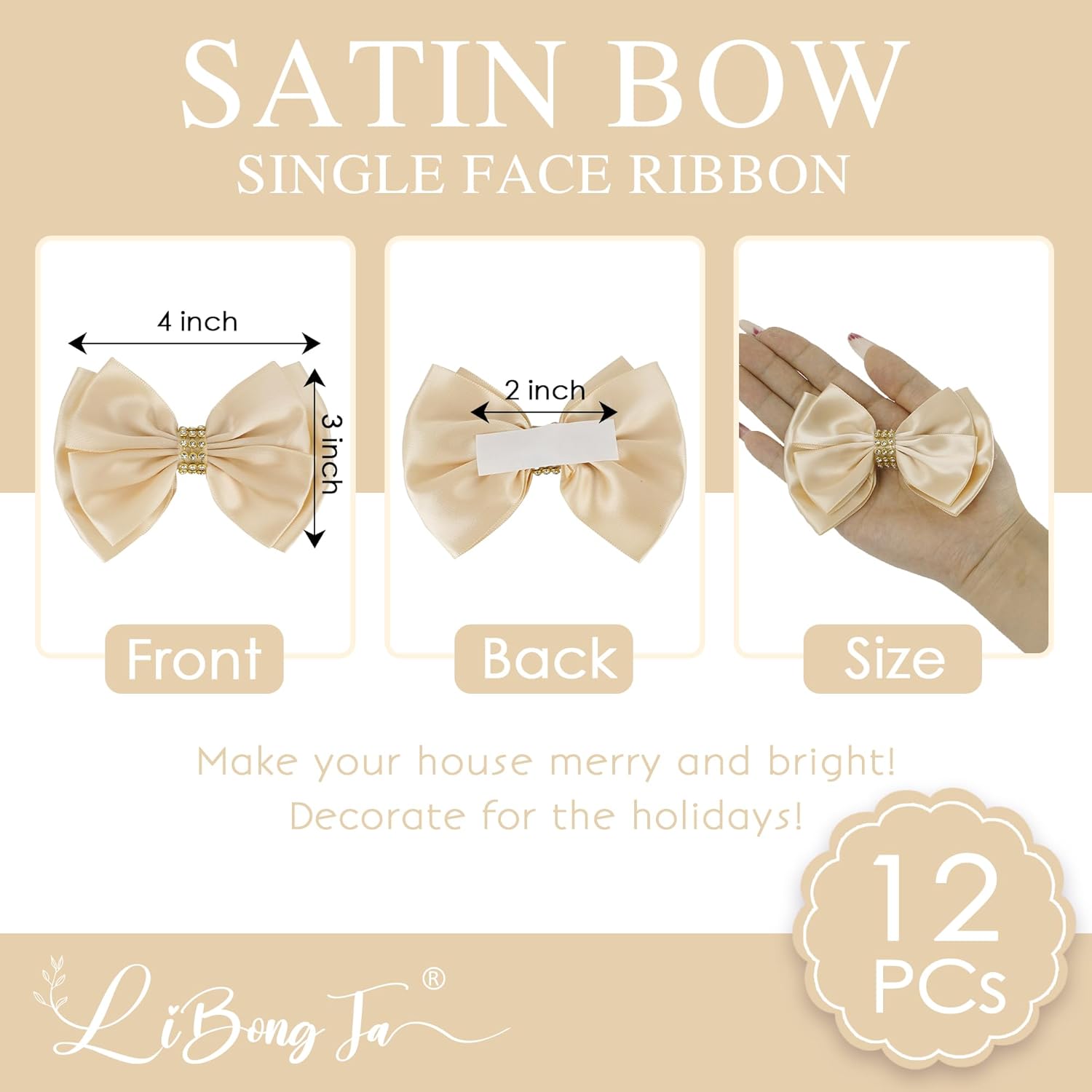 Champagne Gold Ribbon Bow 4'' Premade Satin Bows, Gift Bows with Rhinestone, Wrapping Bow for Presents, Greeting Cards, Treat Bags, Wine Bottle, Valentines Bows for Gift Wrapping-12 Counts
