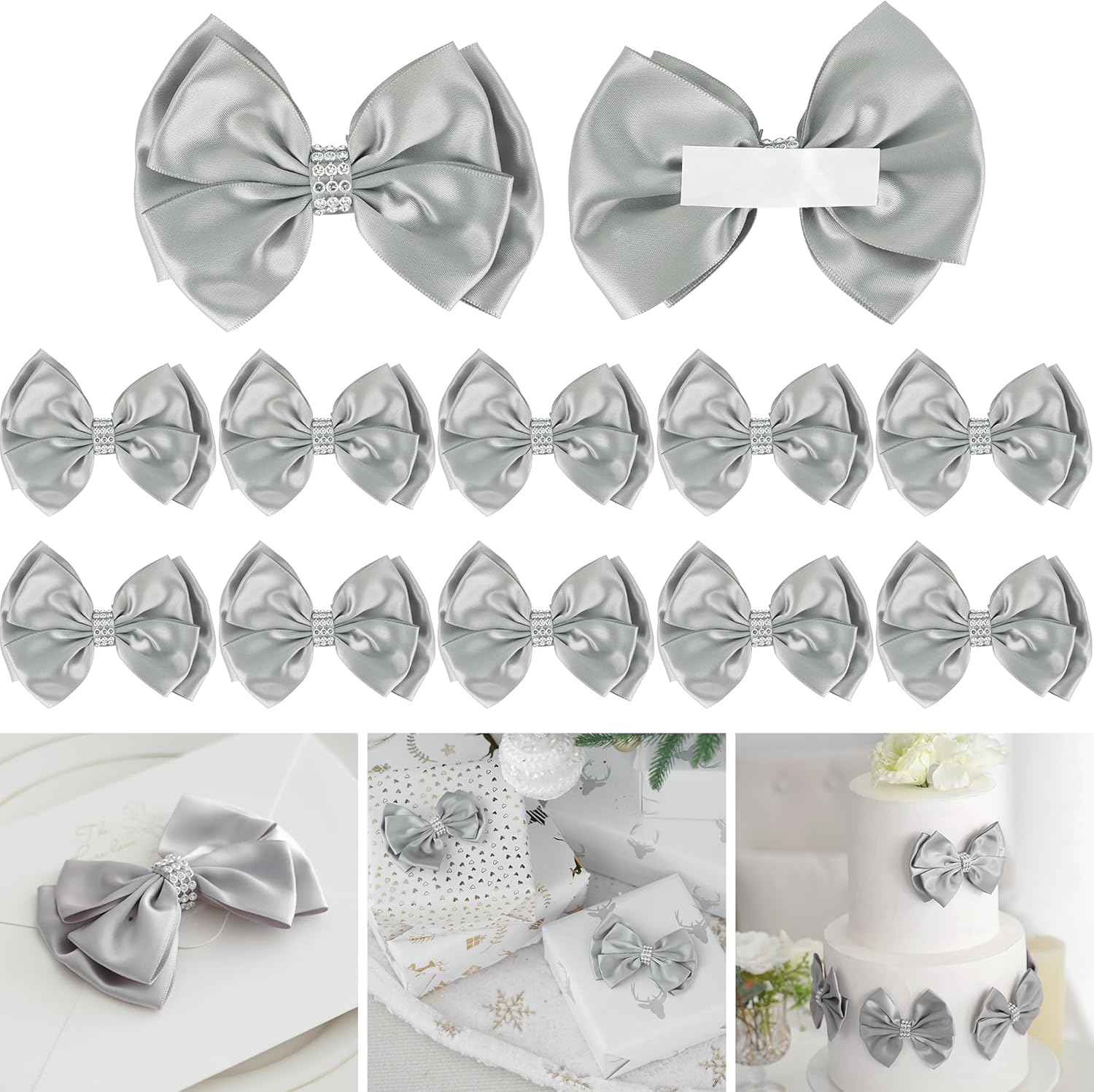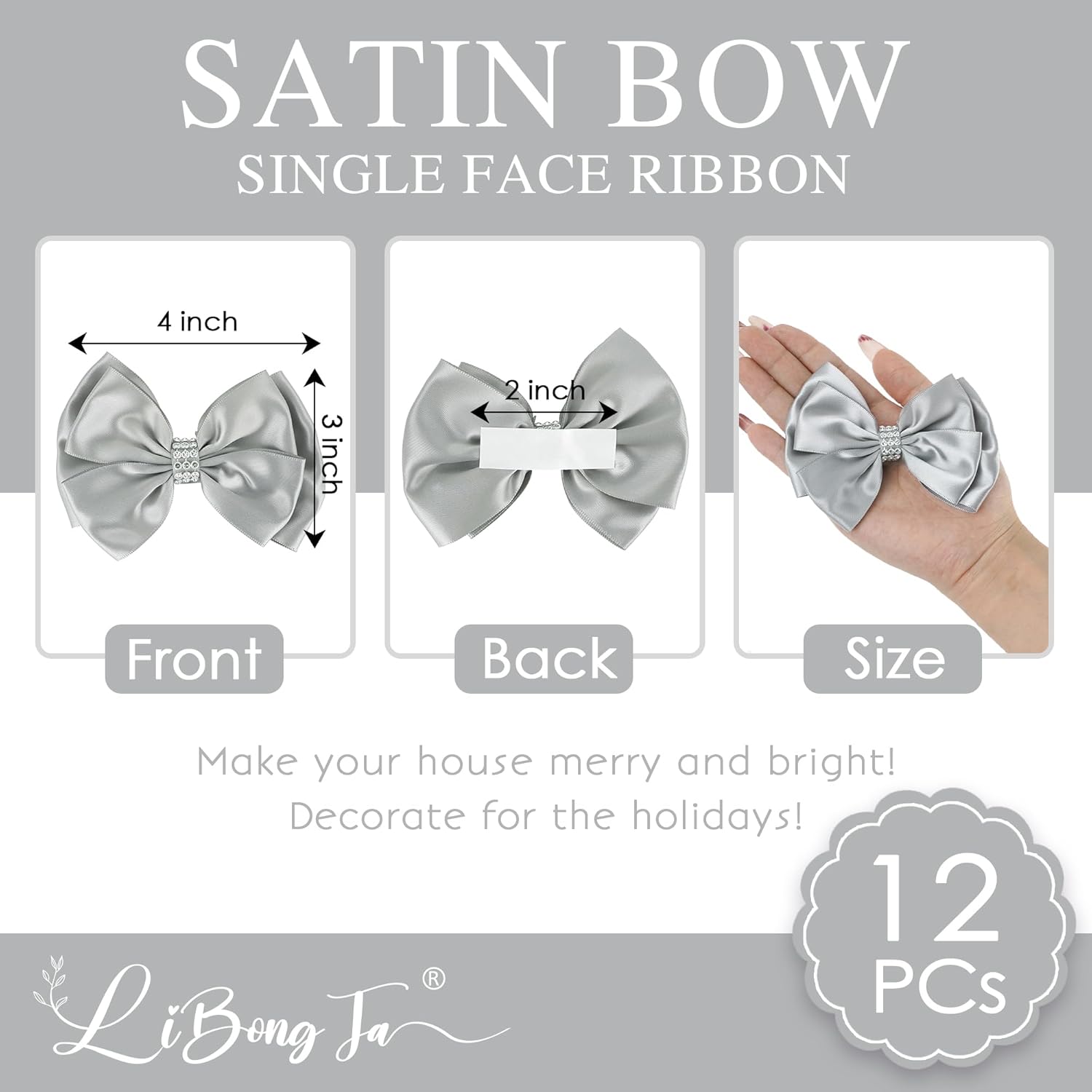 Silver Satin Bows 4'' Premade Ribbon Bow, Silver Gift Bows with Rhinestone, Wrapping Bows for Presents, Greeting Cards, Treat Bags, Wine Bottles, Valentines Bows for Gift Wrapping-12 Counts