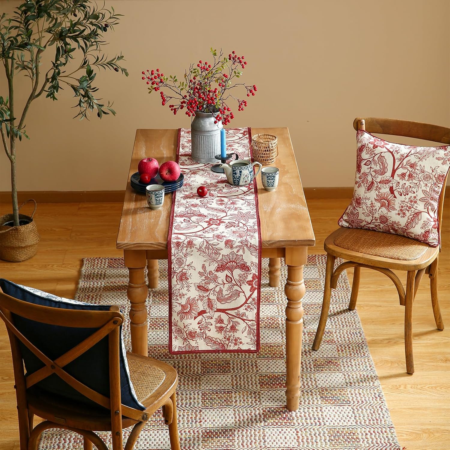 ISAENNE Designer Chinoiserie Elegant Linen Table Runner 102 Inches Long,Red Floral Pattern Decor Table Runners for Thanksgiving,Dining Room,Banquet,Kitchen Tables,Christmas,12"*102"-Ruyi A