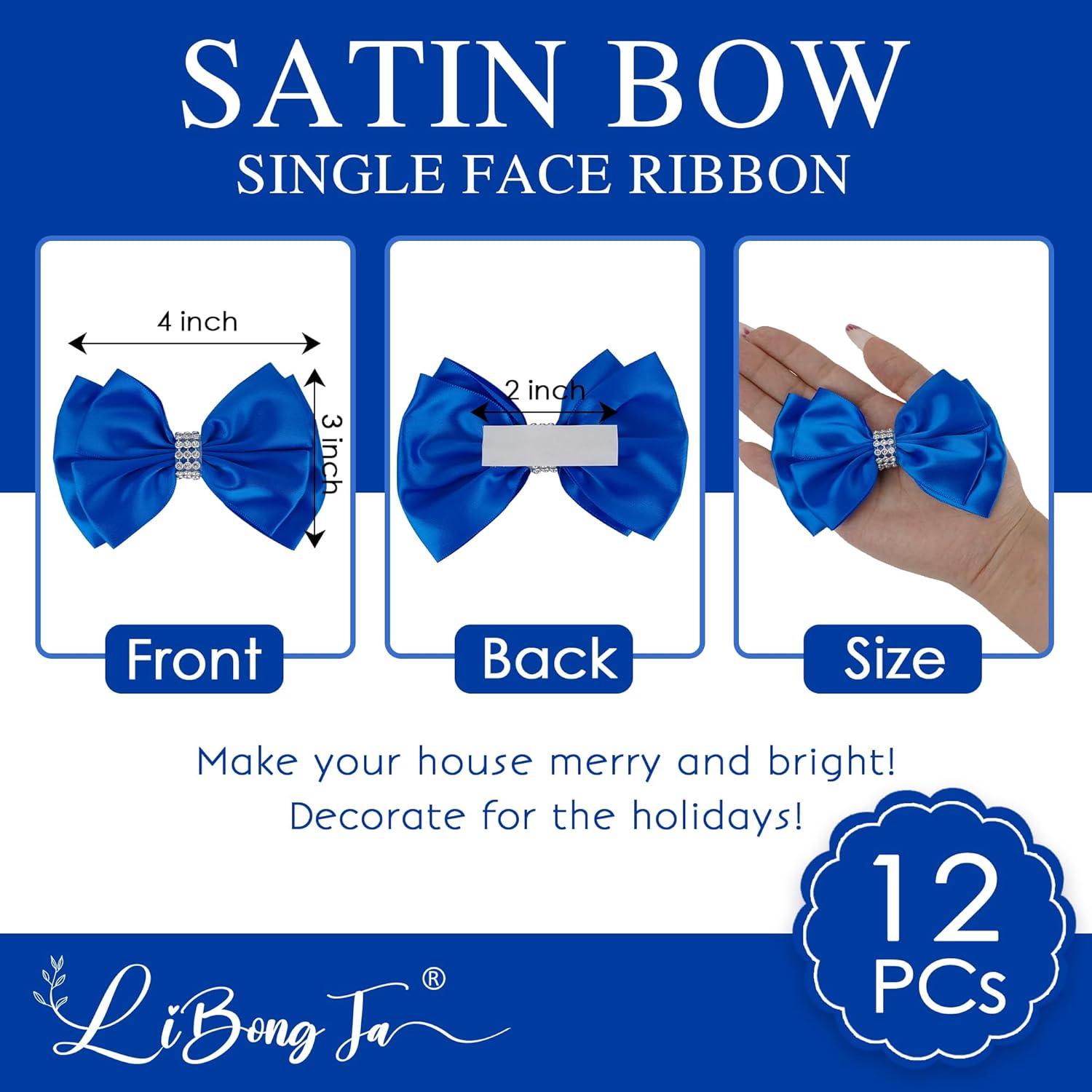 Royal Satin Bows 4'' Premade Blue Ribbon Bow, Gift Bows with Rhinestone, Wrapping Bows for Presents, Greeting Cards, Treat Bags, Wine Bottles, Valentines Bows for Gift Wrapping-12 Counts