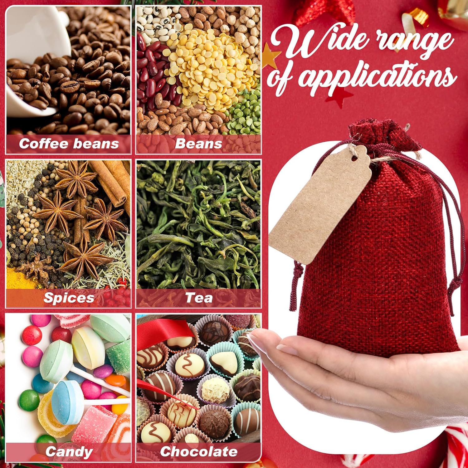 - Included Components : 100 Pcs Burlap Gift Bags, 100 Pcs Gift Tags, 1 Bundle Hemp Rope, 10 Pcs Red Gift Bags
