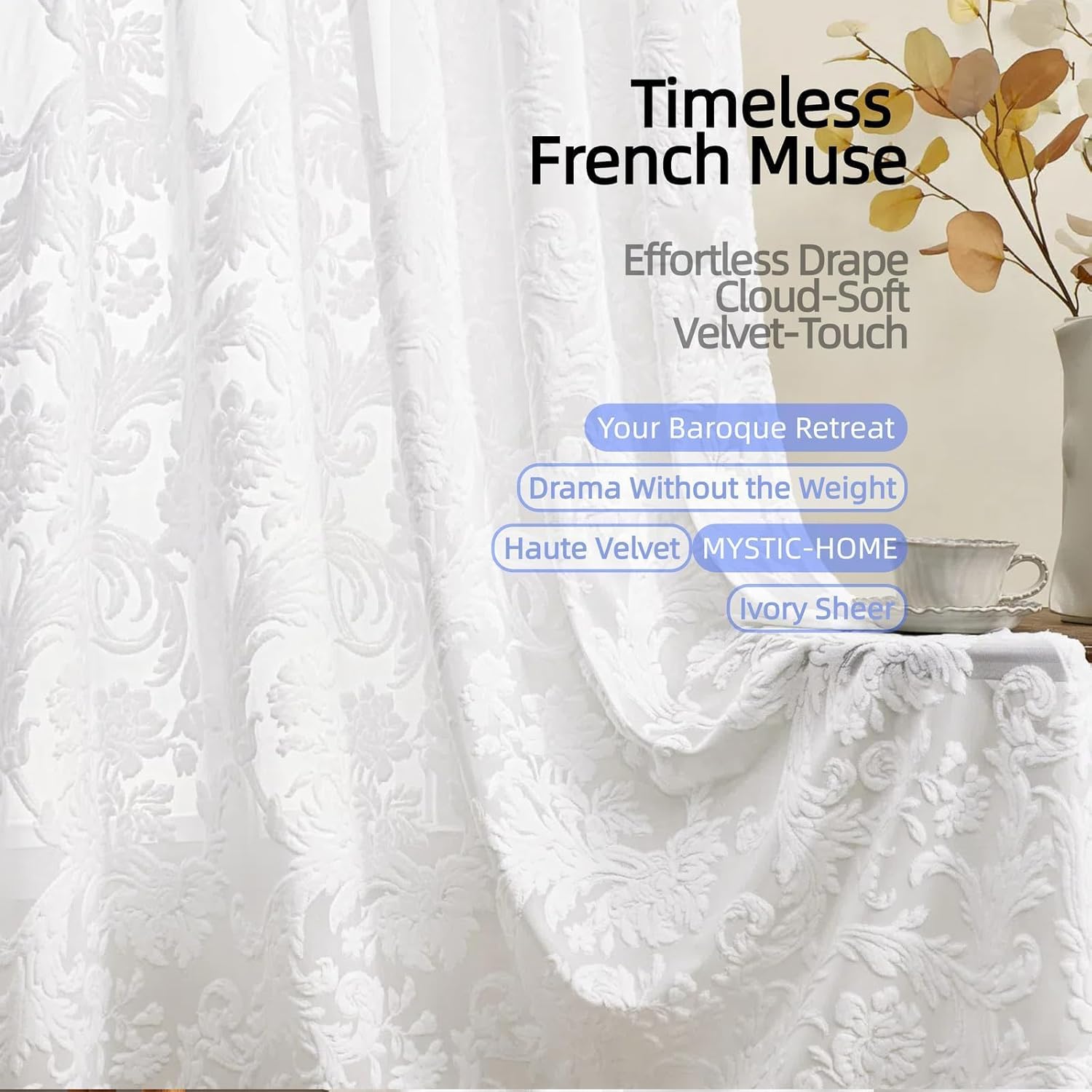 - 1. Elegant & Delicate Sheer Curtains Experience luxury sheer voile with exquisite craftsmanship—every stitch and thread reflects Parisian atelier quality. The 3D flocked texture and Rococo motifs add timeless elegance, while the weighted hem ensures effortless draping.