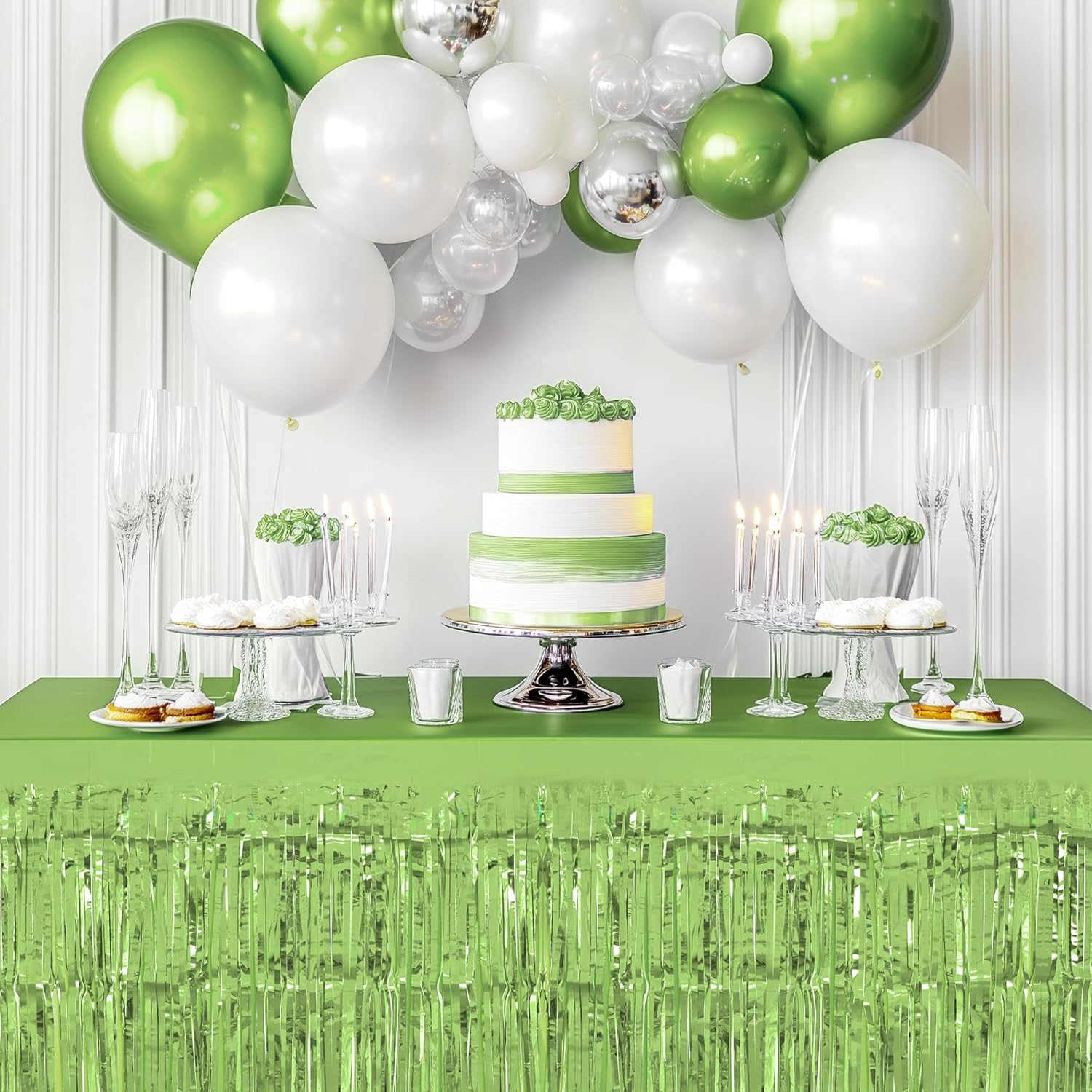 4 Pack Light Green Table Skirts, 29x108" Metallic Foil Tinsel Fringe Table Skirts for Rectangle Tables Streamer Curtains Backdrop, Party Decorations for Birthdays Weddings Holidays