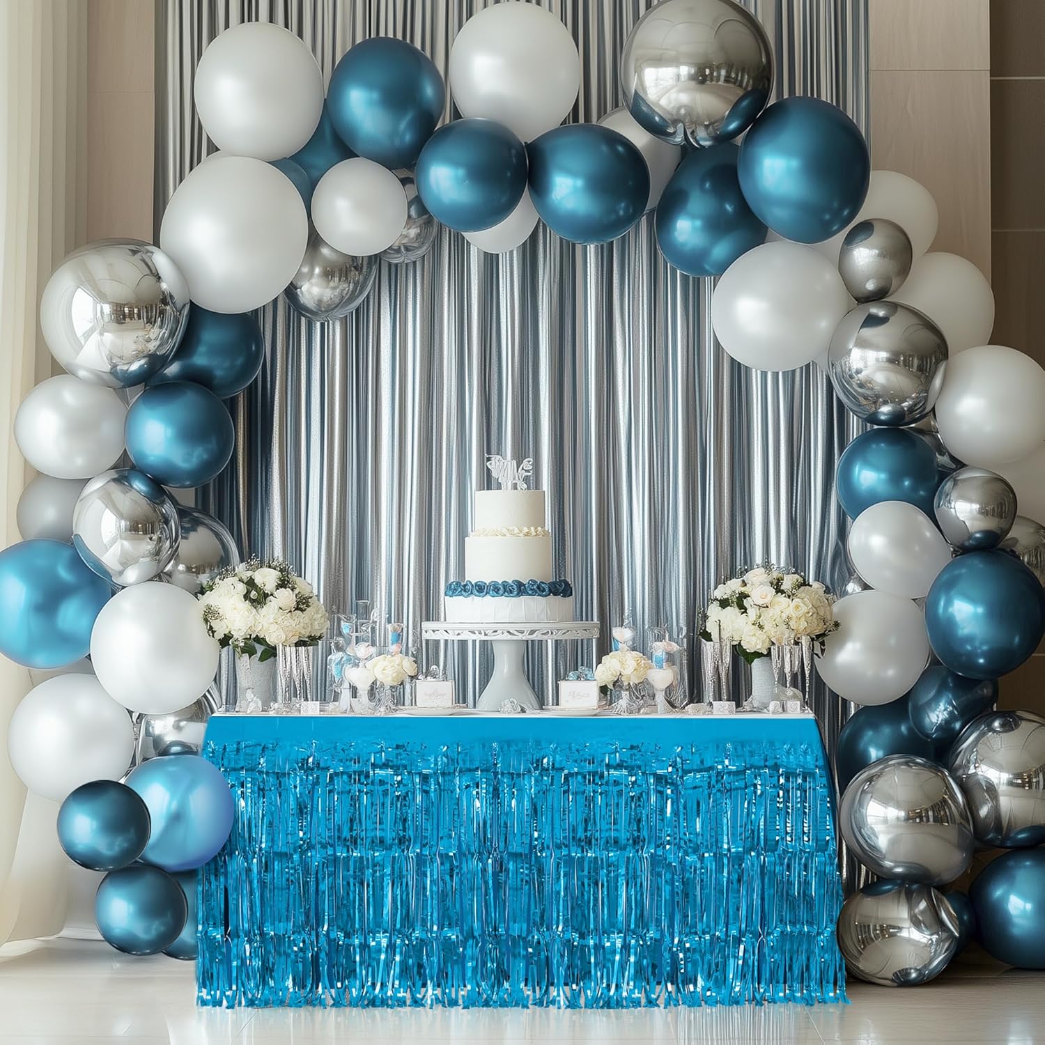 2 Pack Lake Blue Table Skirts, 29x108" Metallic Foil Tinsel Fringe Table Skirts for Rectangle Tables Streamer Curtains Backdrop, Party Decorations for Birthdays Weddings Holidays