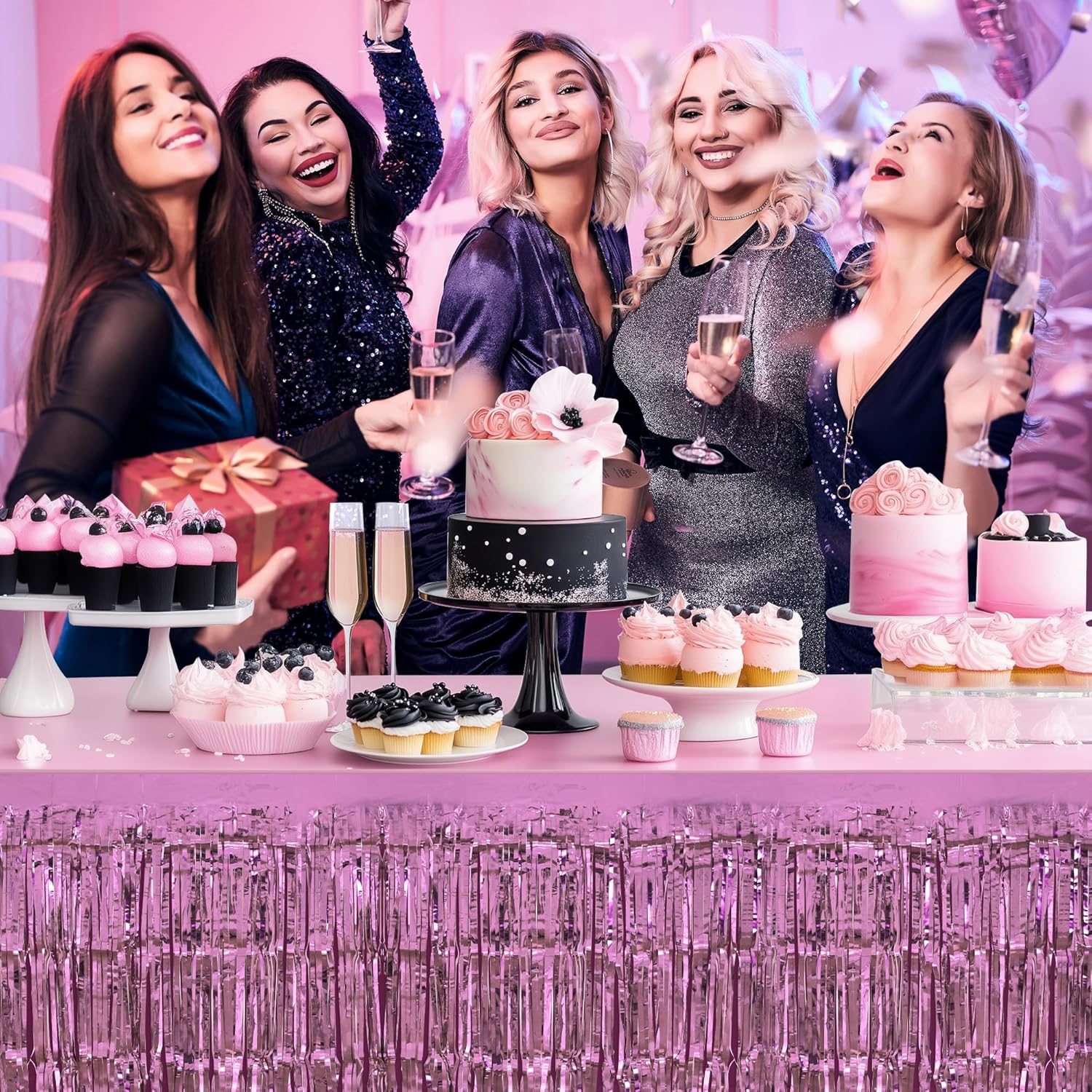 8 Pack Pink Table Skirts, 29x108" Metallic Foil Tinsel Fringe Table Skirts for Rectangle Tables Streamer Curtains Backdrop, Party Decorations for Birthdays Weddings Holidays