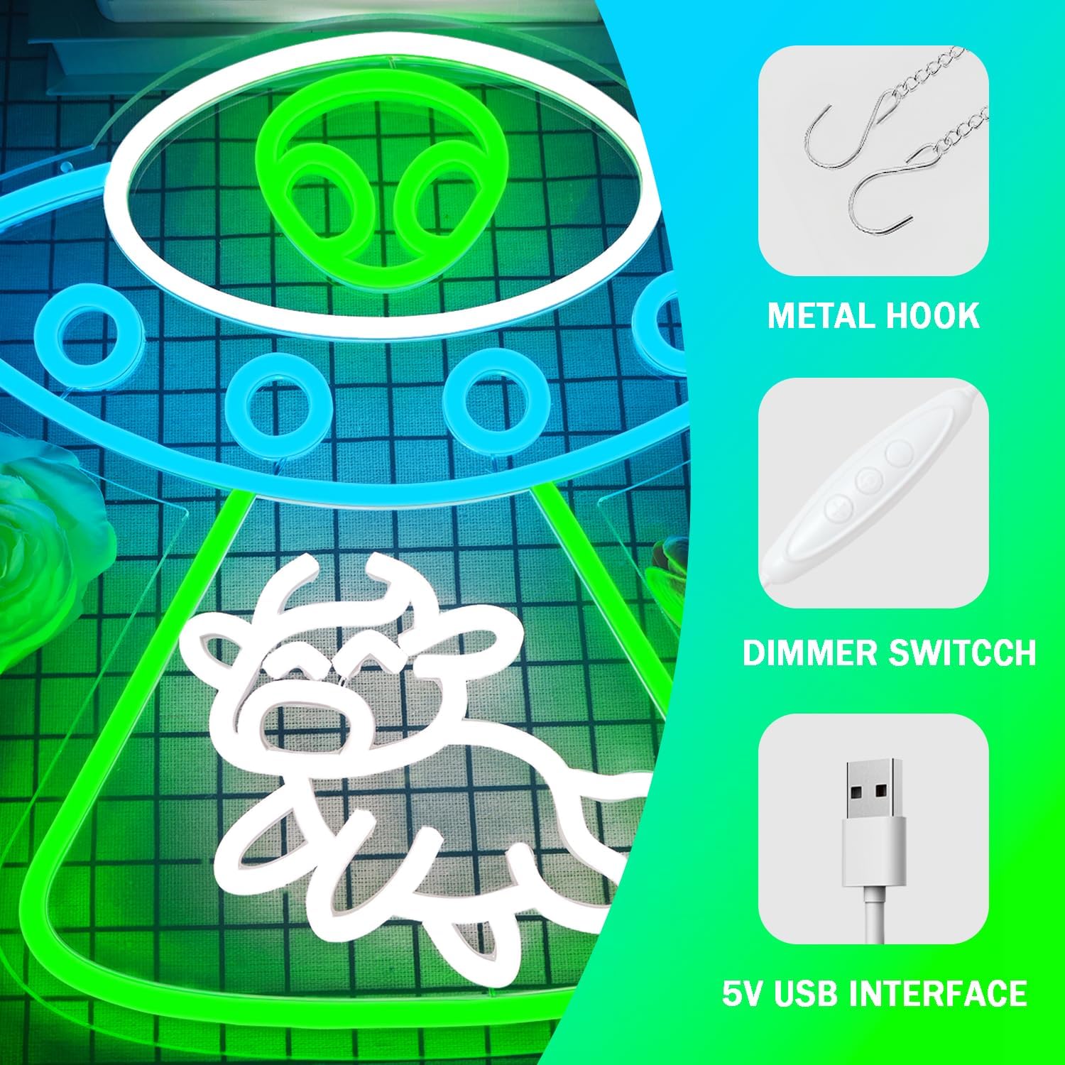 Alien Neon Sign Dimmable UFO Neon Signs for Wall Decor Bedroom Man Cave Alien Spaceship Cow Neon Sign for Kids Birthday Gift