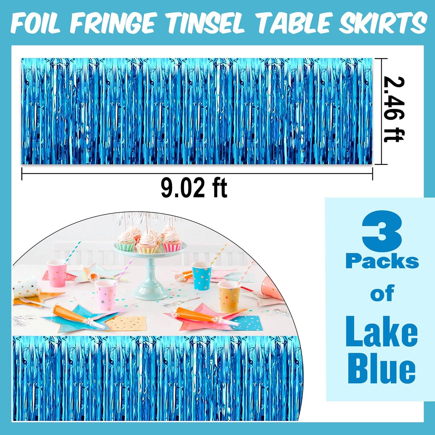 3 Pack 29 x108 Inch Lake Blue Foil Fringe Table Skirts Metallic Banner for Tinsel Streamer Garland Backdrop for Parade Floats Mother's Day, Graduate, Birthday, Wedding Party Decoration