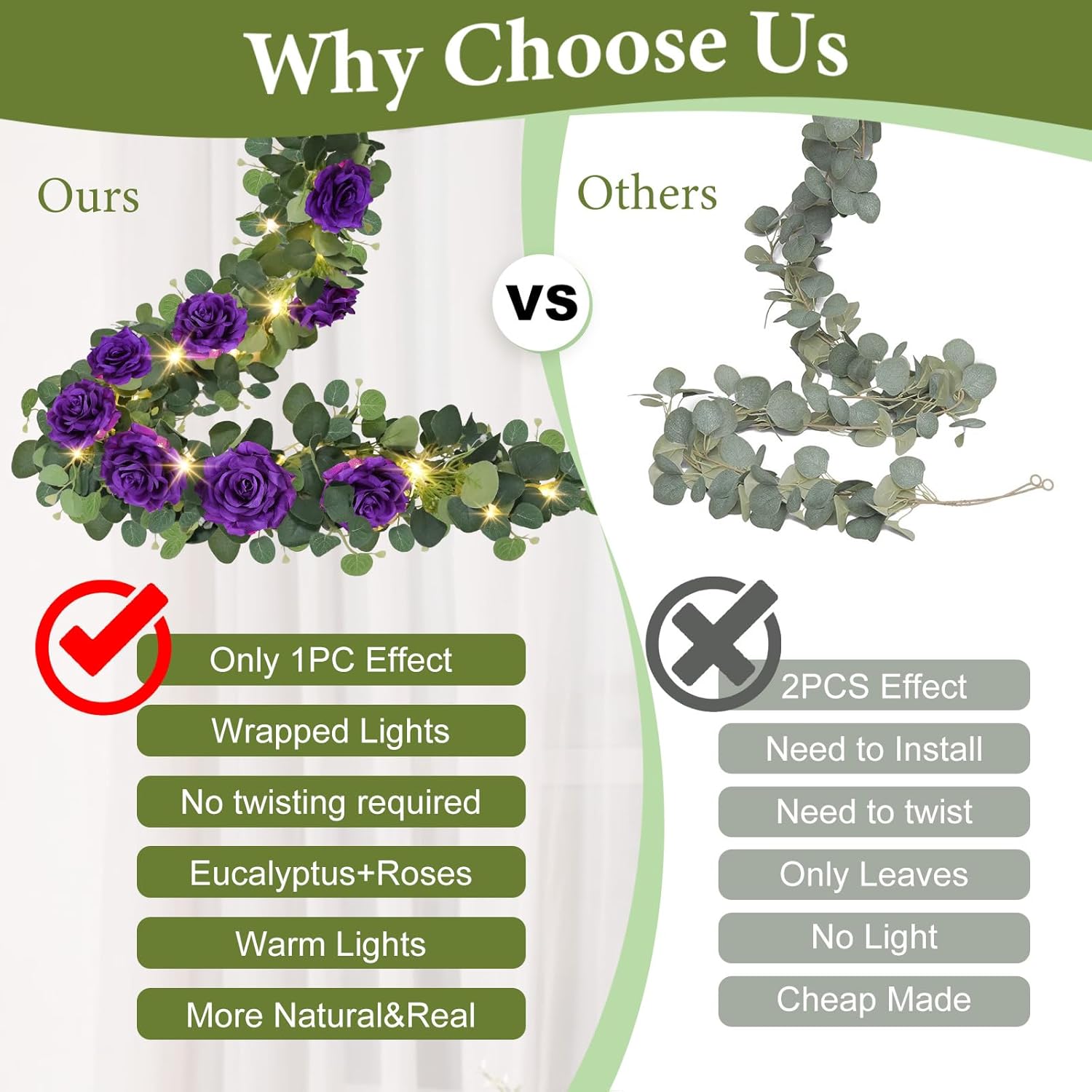 - Eucalyptus Garland with Built-in LED Lights: Transform any space into a magical setting with our 6.6FT eucalyptus garland, now upgraded with built-in led lights! Whether decorating a wedding arch, table centerpiece, fireplace mantel, backdrop, or outdoor garden fence, this rose flower garland brings timeless elegance and a touch of romance to any occasion. The versatile design allows for endless creative possibilities, making it perfect for weddings, Valentines Day, Mothers Day or seasonal celebrations