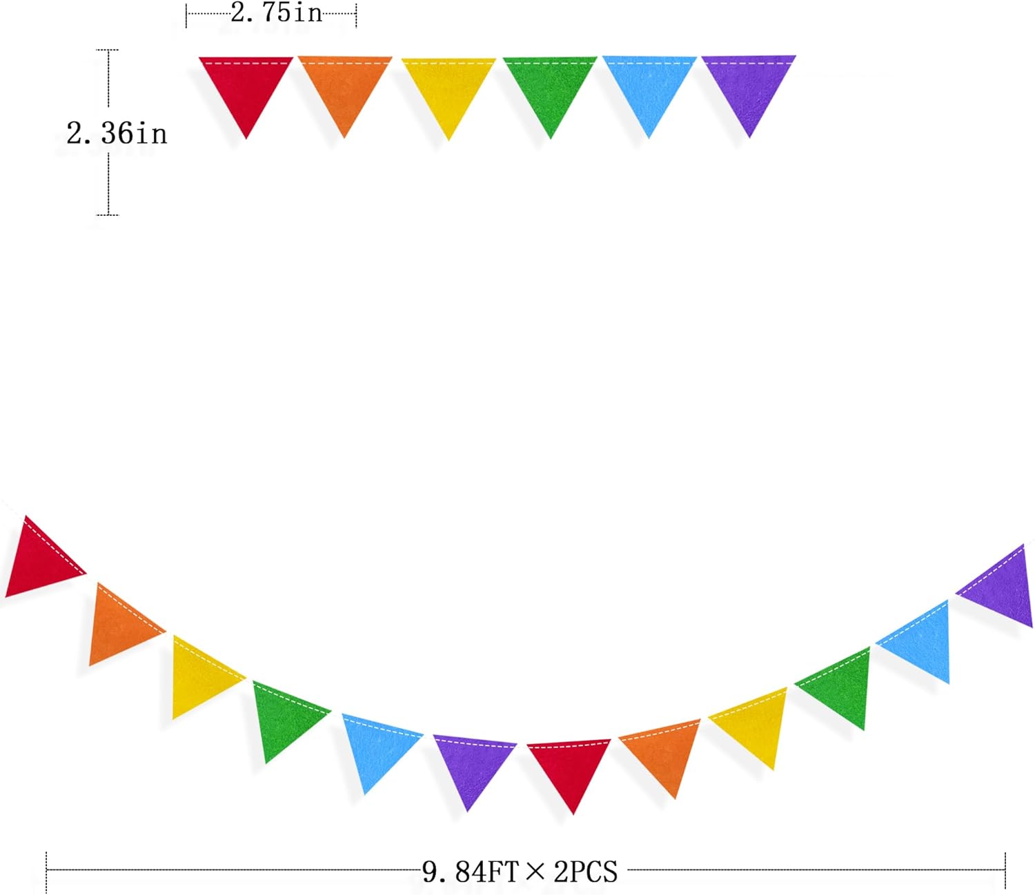 - Package Contains - 2 packs of rainbow mini party bunting banner,Size of each flag is 2.75" Γ 2.36",Each mini triangle flag is 10 feet long,Total is 20 feet.Meeting daily general needs.