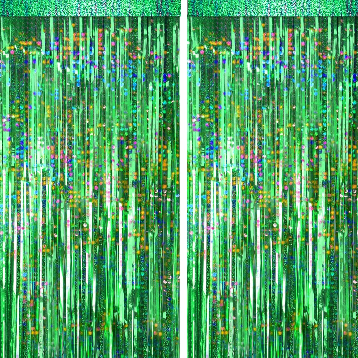 - Shimmery Green Fringe Backdrop: You will receive 4 pieces green tinsel backdrop, each pack curtains size is 3.3ft x 6.6ft, enough length for decorate your party. These foil backdrop curtains are perfect for the door or wall to create an impressive decoration for parties, events, and photo booths.