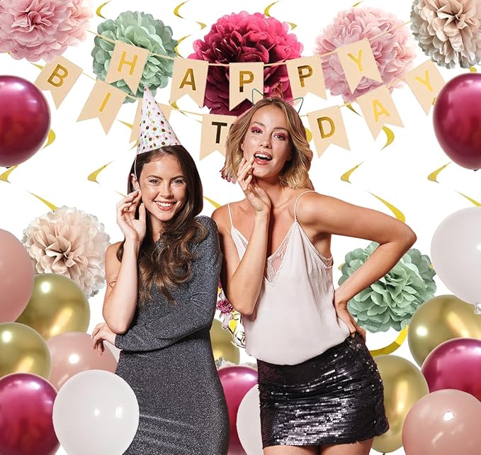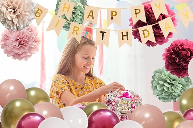 - ✔ 【What you will get 】- Package Included Rustic Happy Birthday Paper Banner , Hanging swirls 8pieces, 30 pieces assorted balloons (Burgundy,Dusty pink, Gold ,White),8pieces Tissue Pom Poms in 12inch and 10inch , 2 rolls free ribbons