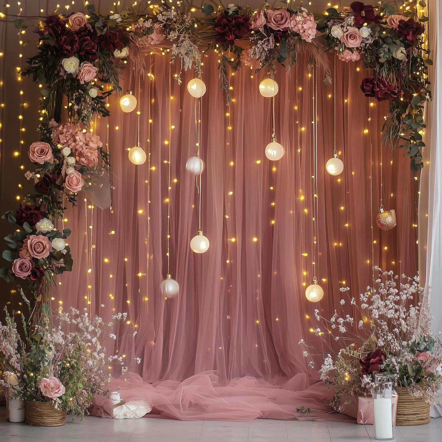 - Package Includes: 2 panels dusty rose tulle backdrop curtains, each sheer curtain backdrop is 5FT width and 8FT height. Also it includes a set of 10FT (10 strands) warm string light (USB powered,no remote control) and 12pcs transparent clips.