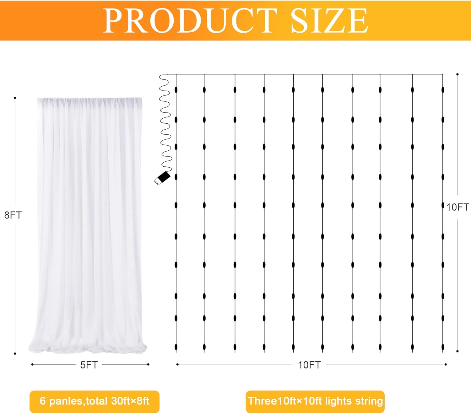 - Package Includes: The package includes 6 panels White sheer tulle backdrop curtains, each curtain backdrop is 5FT width and 8FT height. Also it includes 3 set of 10FT (10 strands) warm string light (USB Powered) and 36pcs transparent clips.