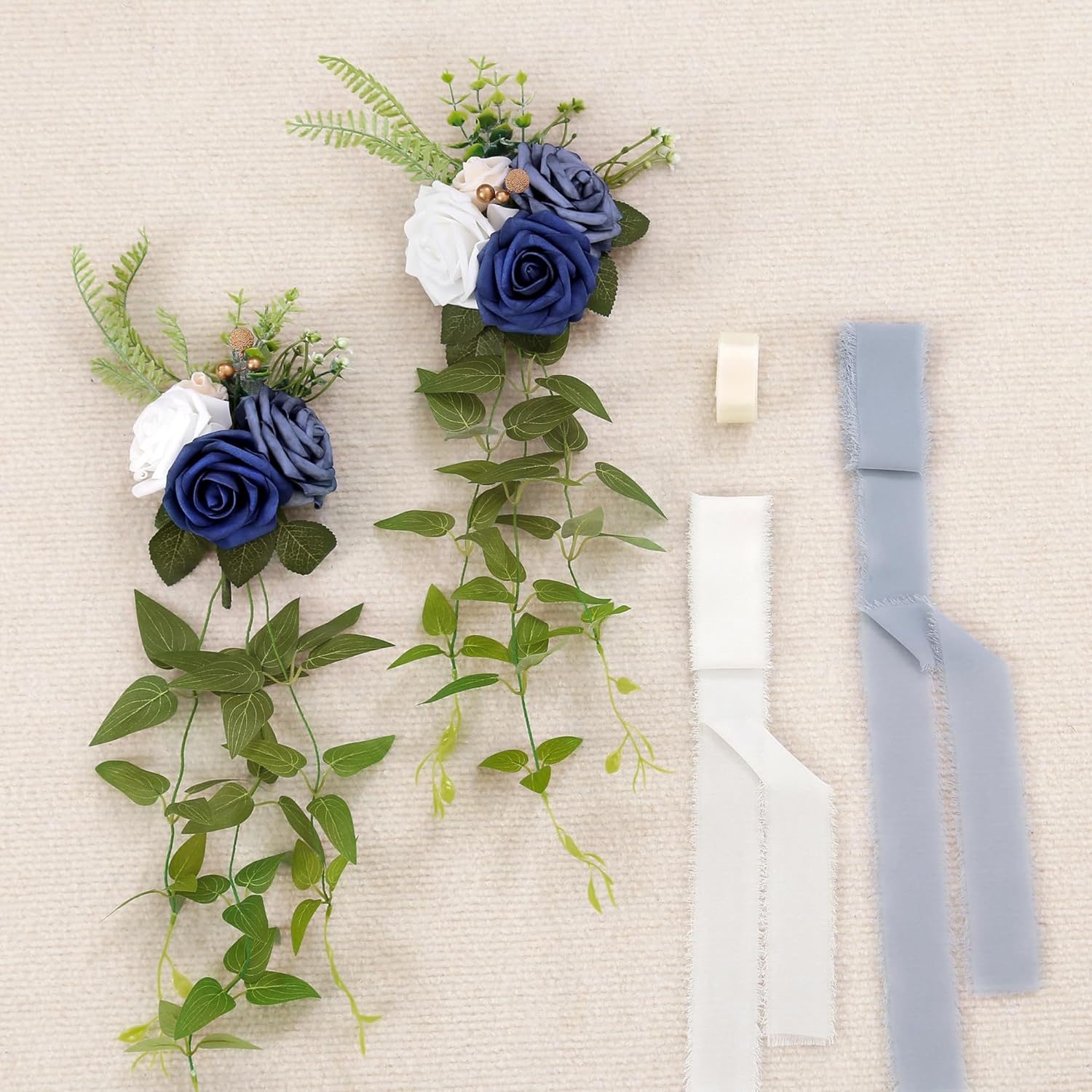 - Details: open big dark blue / dusty blue / white roses, open small cream rose, gold beads, clematis leaves, green eucalyptus leaves make the whole pew flower approx 5.5" diameter; chiffon fabric drapes folded length 1.5yards, and the silk-like ribbons are ivory and dusty blue; extra one 70cm ribbon attached for easy tying.