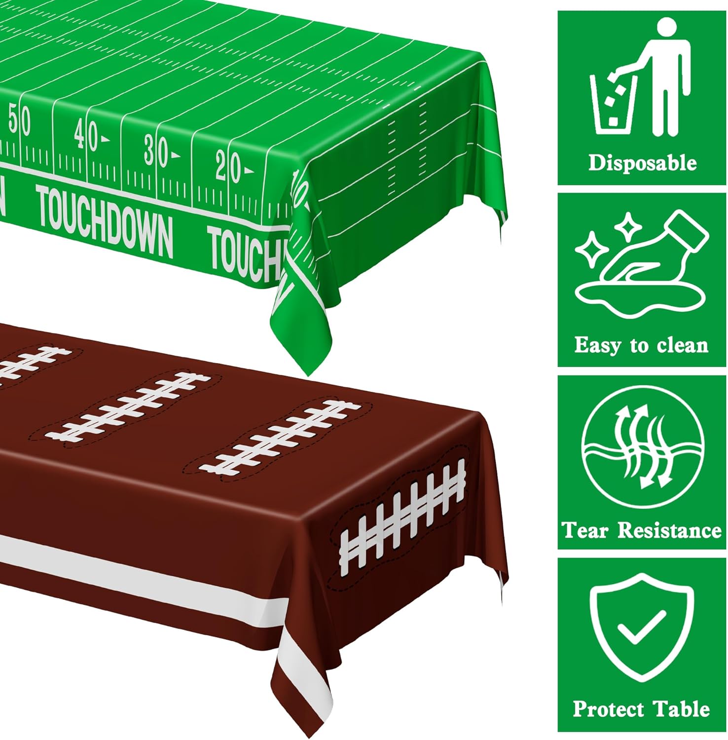 - Dimensions & Quantity: Each pack contains two football table cloths, each measuring 108 inches in length and 54 inches in width, providing ample coverage for standard-sized tables.