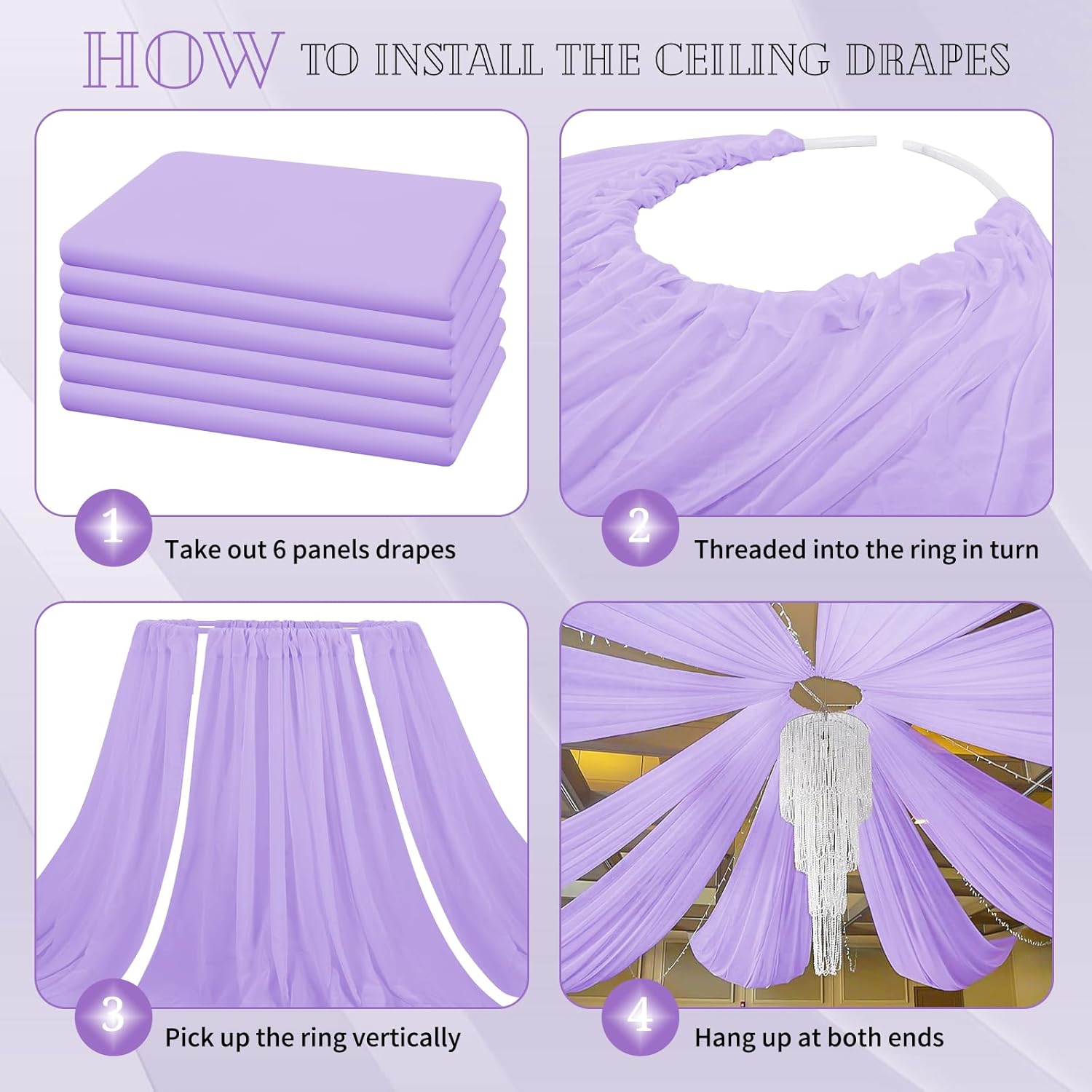 - 【Chiffon Fabric Curtain】The package will include 6 panels lavender wedding ceiling drapes (Not include stand !!!), each wedding extra long curtain measures 5 feet(60inch)wide x10 feet(120inch) long. Sufficient quantity can meet your needs. These arch draping are applicable for any indoor and outdoor occasion either for decorative or functional uses.