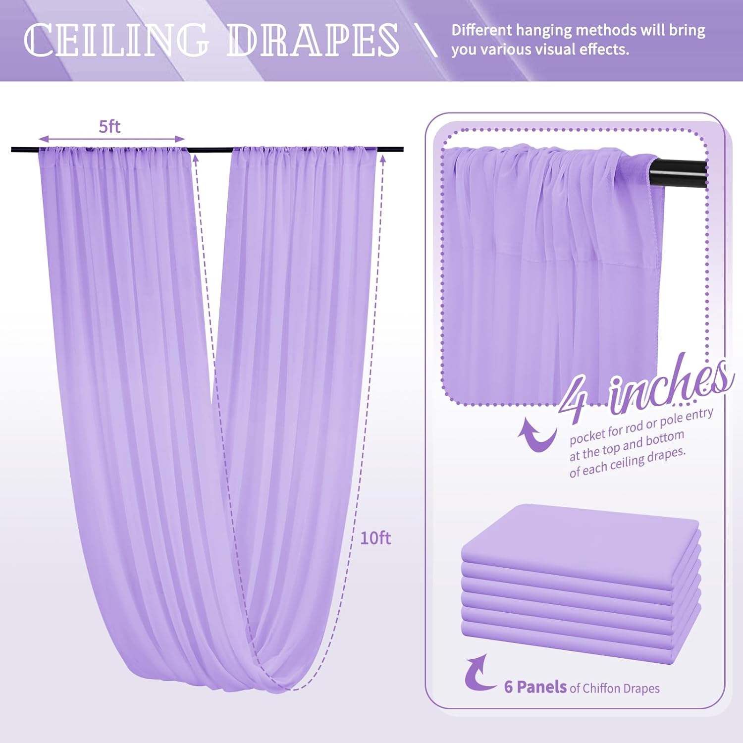 6 Panels Lavender Ceiling Drapes for Wedding 5ftx10ft Chiffon Fabric Arch Draping Curtains Sheer Drapery for Party Ceremony Birthday Baby Shower Reception Stage Swag Ceiling Decorations