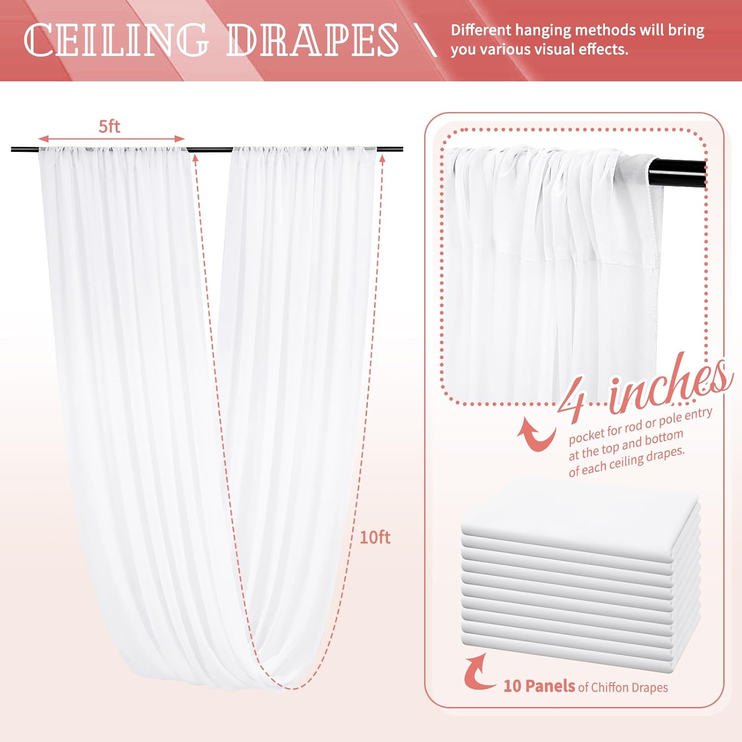 10 Panels White Ceiling Drapes for Wedding 5ftx10ft Sheer Drapery Chiffon Fabric Arch Draping Curtains for Party Ceremony Birthday Baby Shower Reception Stage Ceiling Decorations