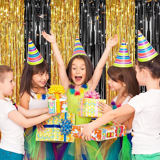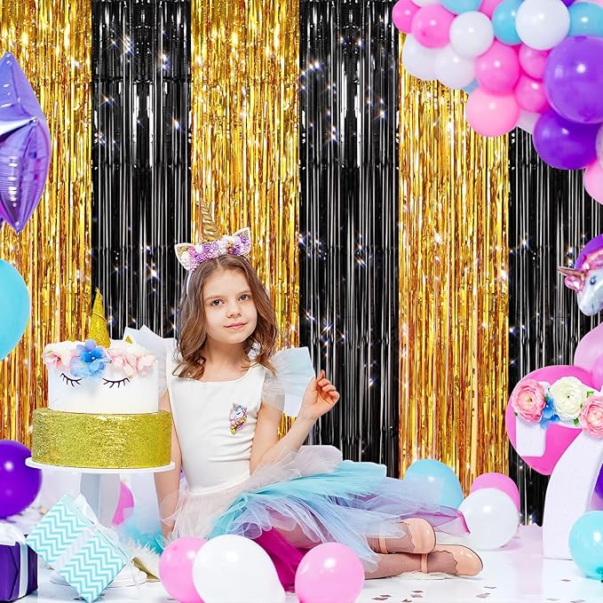 2 Pack Black Gold Metallic Tinsel Foil Fringe Curtains, Door Streamers Photo Booth Backdrop for Birthday Party, Tinsel Curtain Backdrop for Baby Shower Bachelorette Christmas Party Decorations