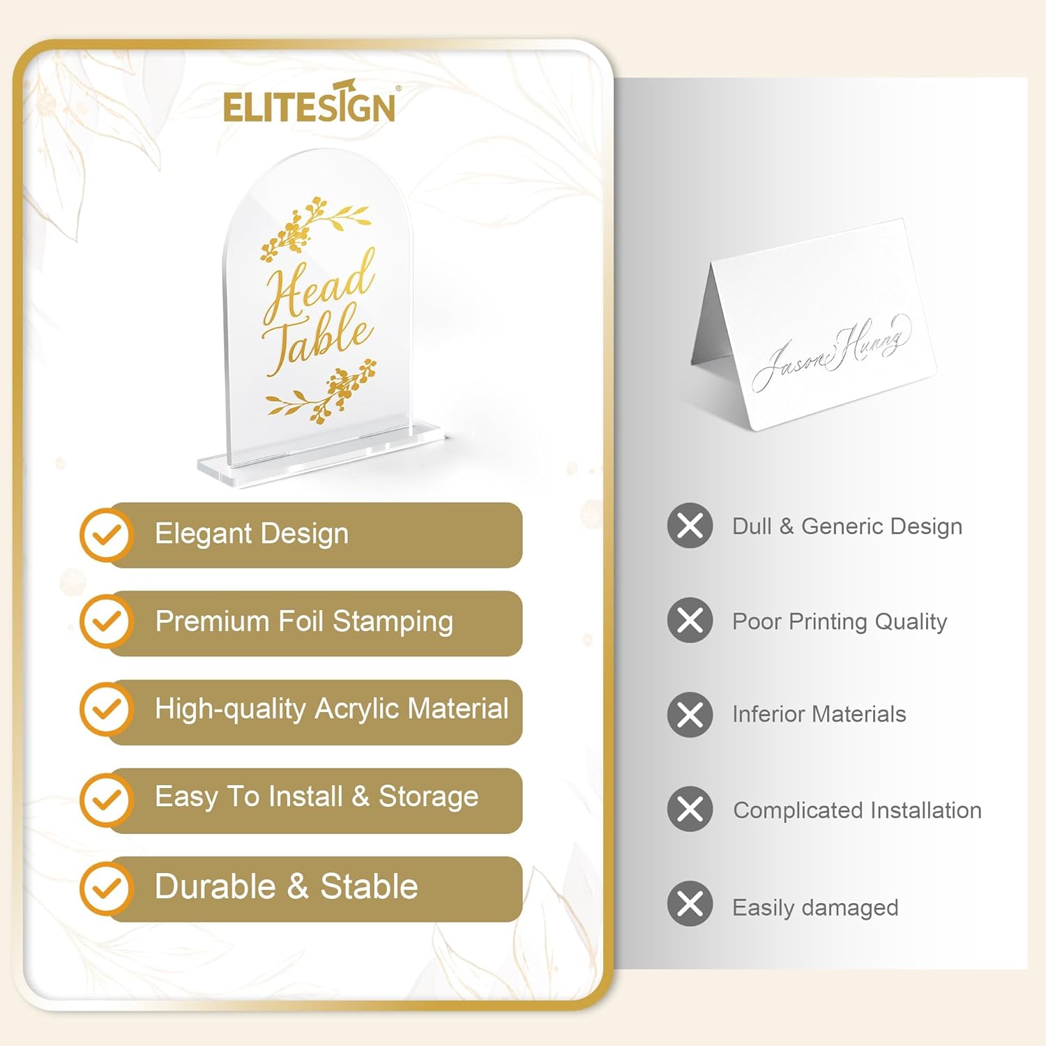 - Why Clear Acrylic Wins: Elegant Transparency (No cheap gold paint chipping).Venue-Friendly (Matches marble/wood tables). Reusable (Wipe clean for next event)
