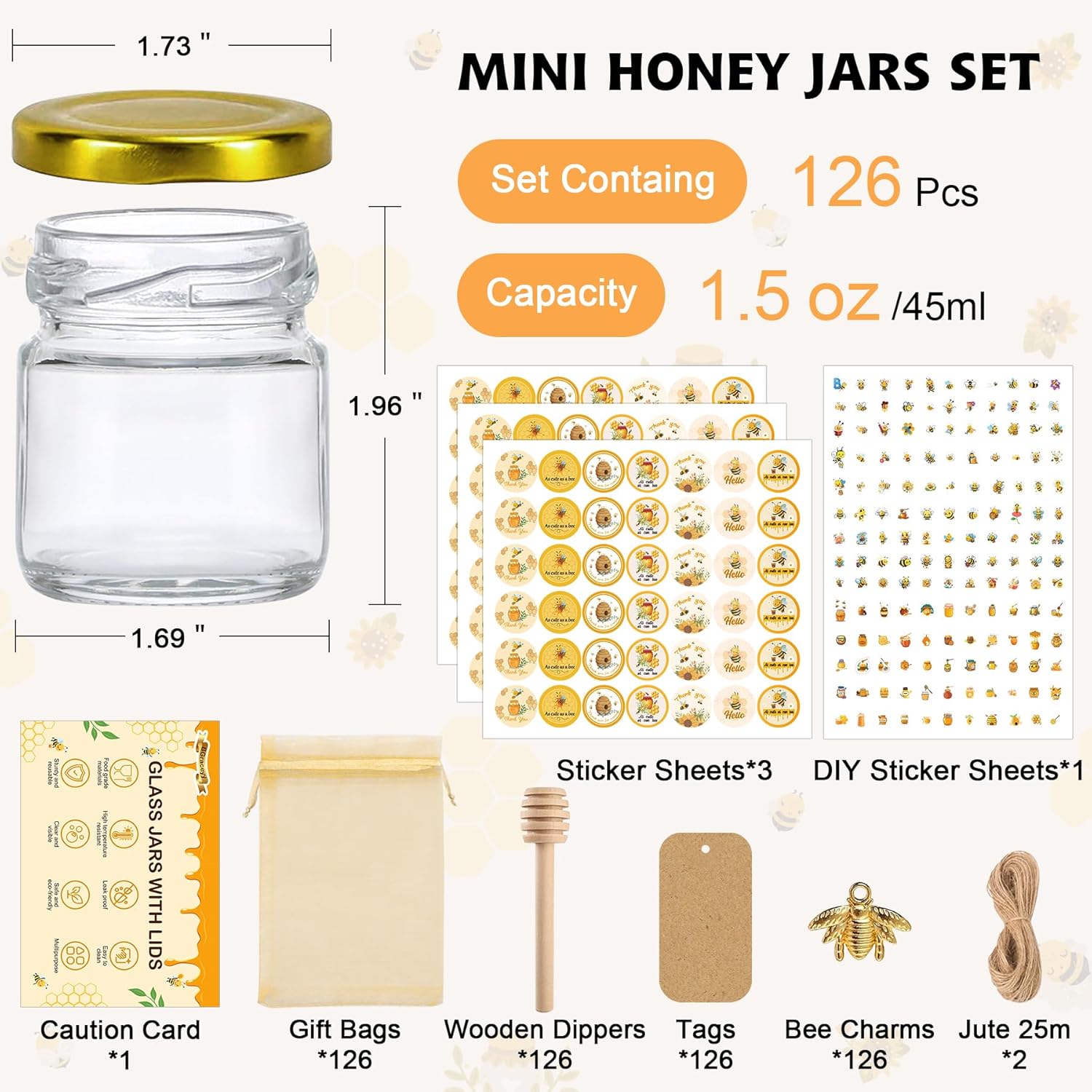 - 【Exquisite Small Honey Jars Set】Our mini jars of honey set includes 126 mini honey jars with dippers, lids, bee charms, gift bags, tags, stickers, and jute twine. The 1.5 oz glass honey jars with lids blend elegance and practicality, turning simple gestures into heartfelt treasures.