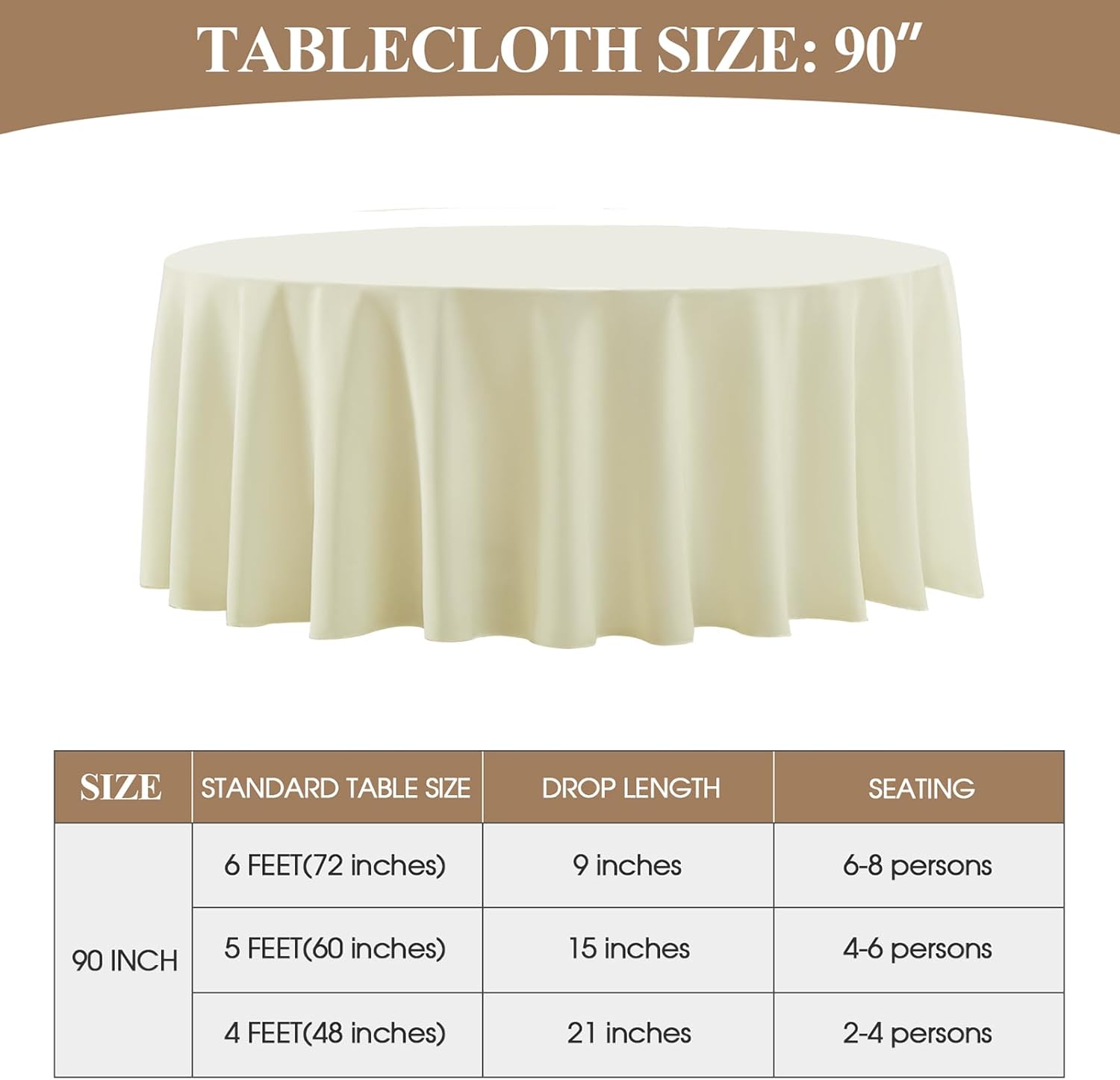 - Suitable Size: This polyester round tablecloth has multiple sizes to choose from, 90, 108, 120, 132 inches, which can meet the needs of tables of different sizes. In order to buy a tablecloth that is more suitable for your table, please measure the actual size of your table before purchasing and refer to our size chart