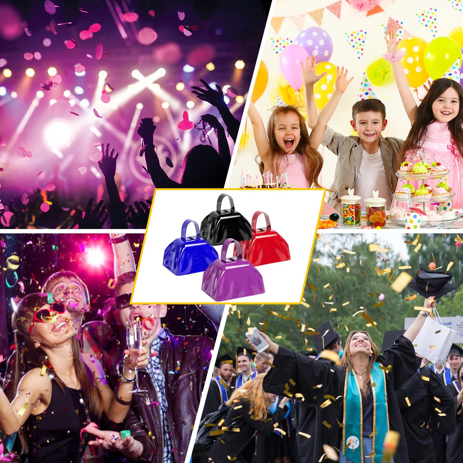 - MULTIFUNCTIONAL COWBELLS: These versatile cowbells are perfect for creating festive noise at sporting events, holidays (Christmas, Halloween), weddings, parties, and more! They also serve as a handy signaling device for seniors or people with disabilities who need to attract attention.