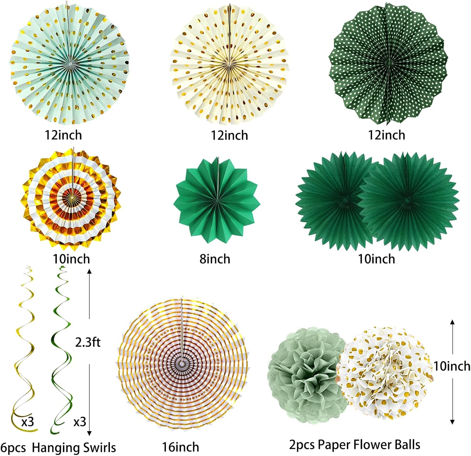 - 【UNIQUE DESIGN】 Whether it's a party of any kind or a graduation celebration. The unique green and gold party decorations will light up your party and make a huge impact. The paper flower balls and paper fans are different from each other. This design makes your party more vivid and gorgeous. This will fit most theme parties and add to the atmosphere