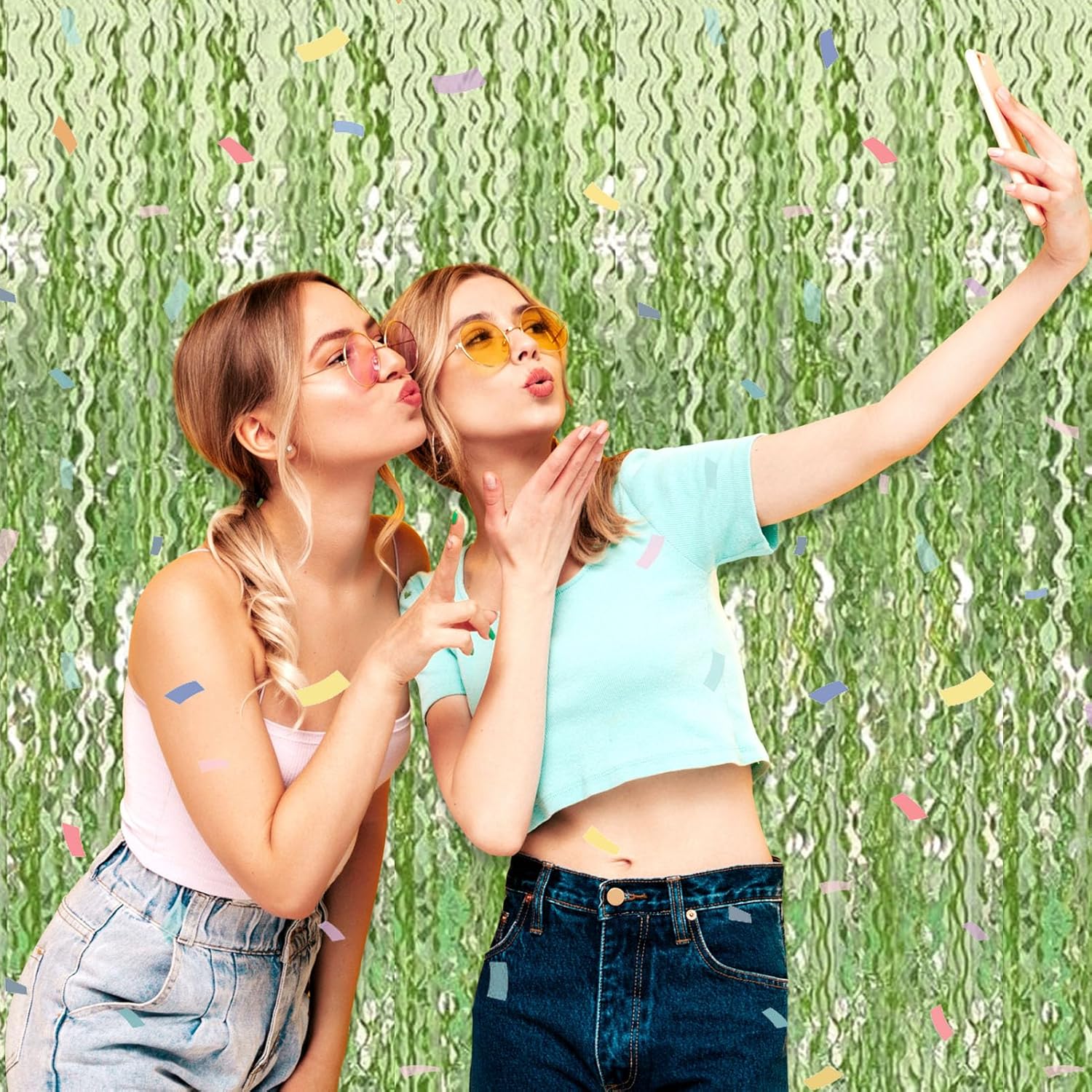4 Pack Light Green Wave Foil Fringe Curtain Backdrop, 3.28Ft x 8.2Ft Metallic Tinsel Foil Fringe Streamer Curtains for Photo Booth, Mother's Day, Easter, Birthday, Wedding Party Decoration